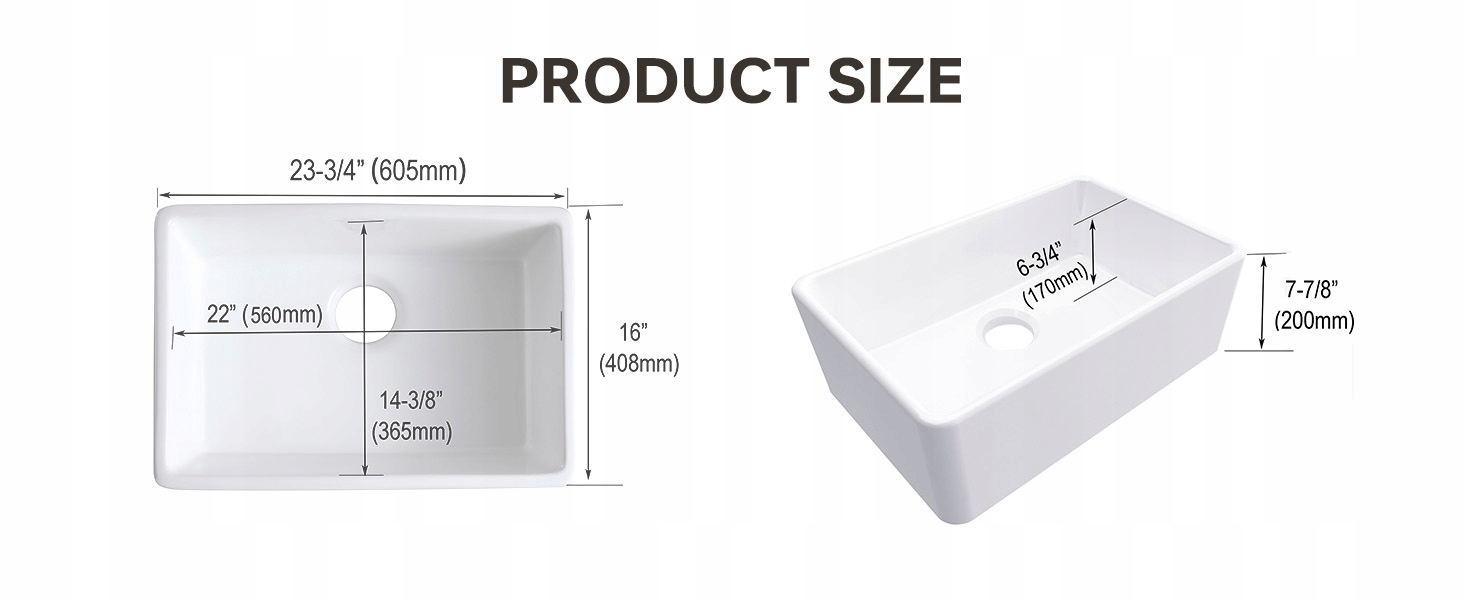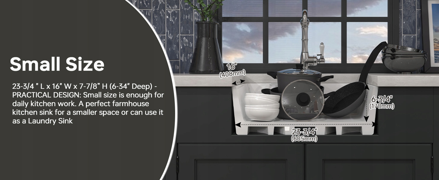 [Дизайн небольшого размера]: эта 24 -дюймовая раковина фермы имеет прямые линии и округлые углы внутри, что делает его современным и стильным, одновременно легко чистить. Меньше стандартных кухонных раковинов, хороший выбор для маленькой кухни или как раковины.