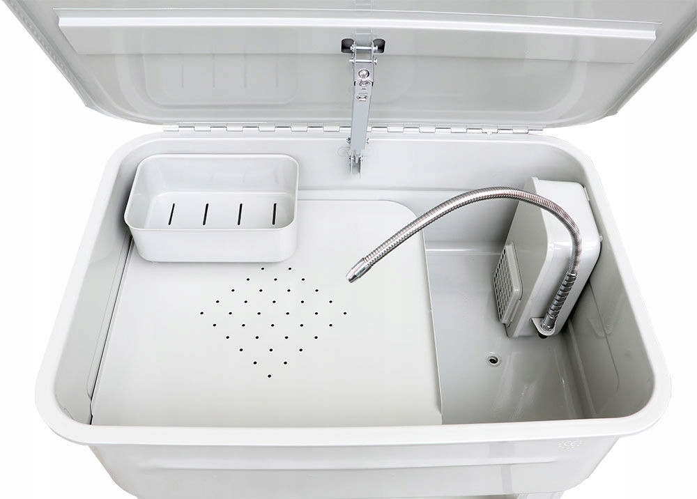 Жидкость засасывается насосом со дна емкости и подается под давлением через гибкий шланг длиной 50 см. Стиральная машина представляет собой отдельно стоящее устройство на 4 устойчивых ножках. К ножкам прикреплена практичная и полезная полка. Внутри моечной кабины имеется дополнительная небольшая ванна и дополнительный съемный верх.