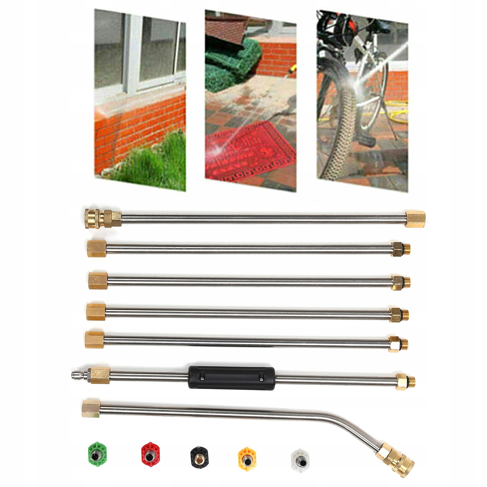 1. В комплект входят 5 насадок для мойки высокого давления, 6 прямых удлинителей и 1 изогнутая насадка.
