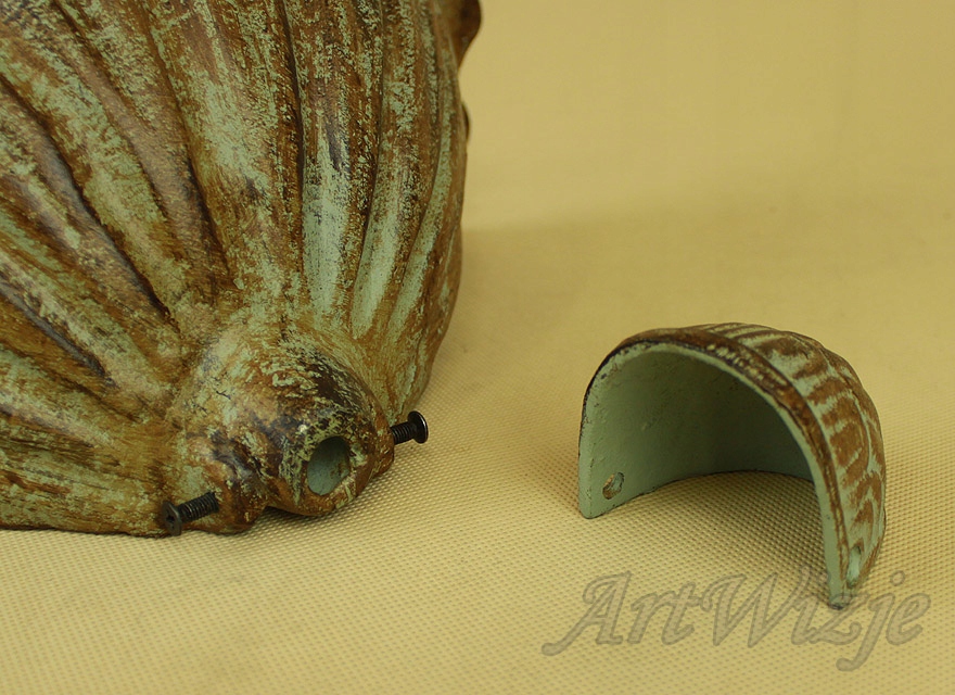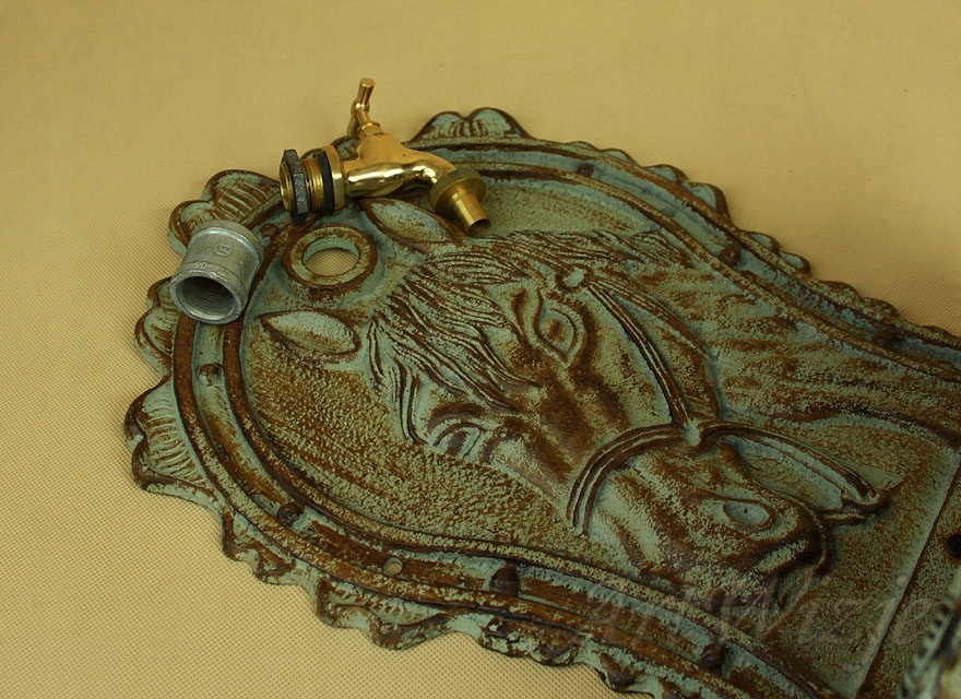 Чугунная настенная садовая раковина зеленого цвета с потертостями (патина), украшенная изображением коня.