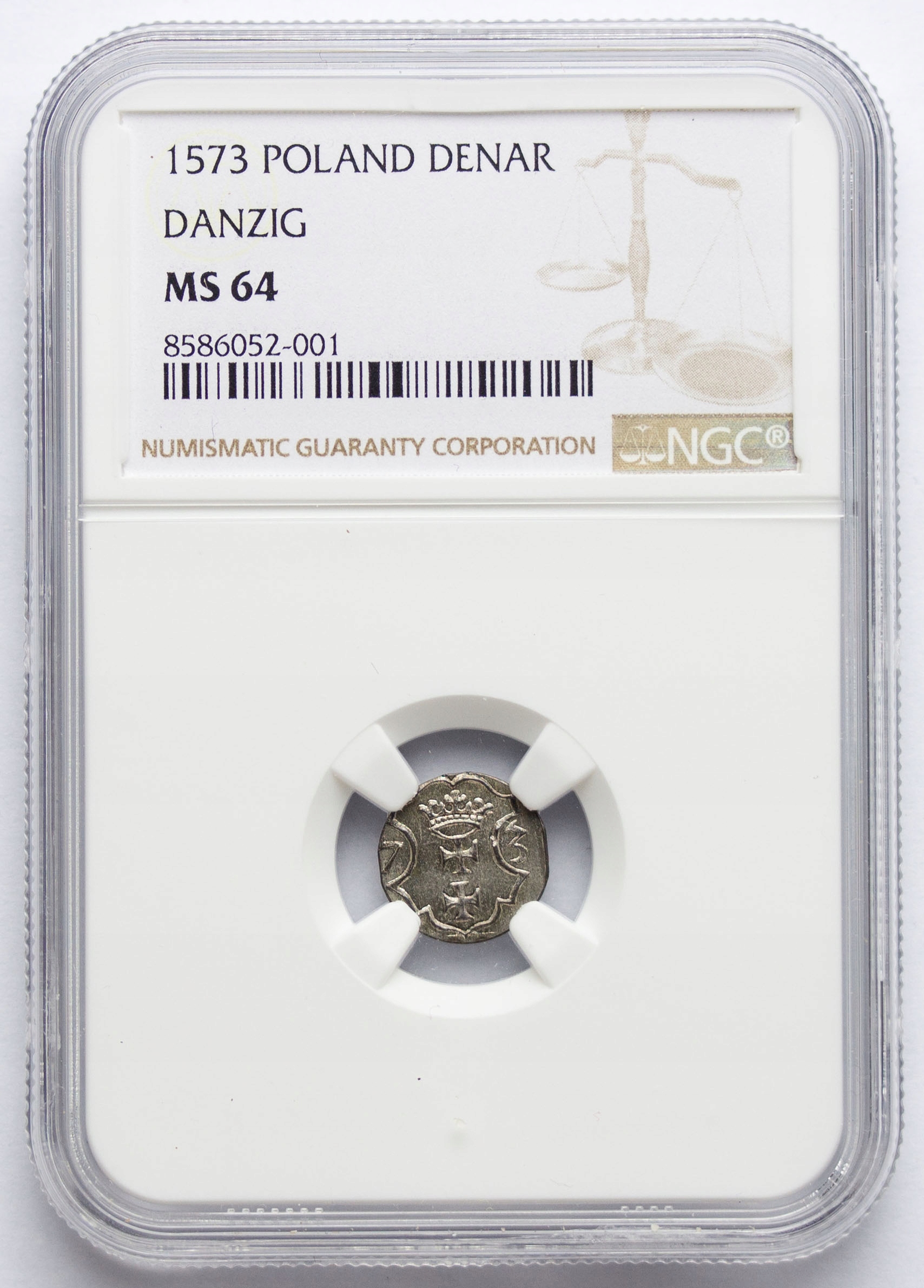 Междуцарствие, Денарий 1573, Гданьск, 12 дуг, NGC MS64, КРАСИВАЯ