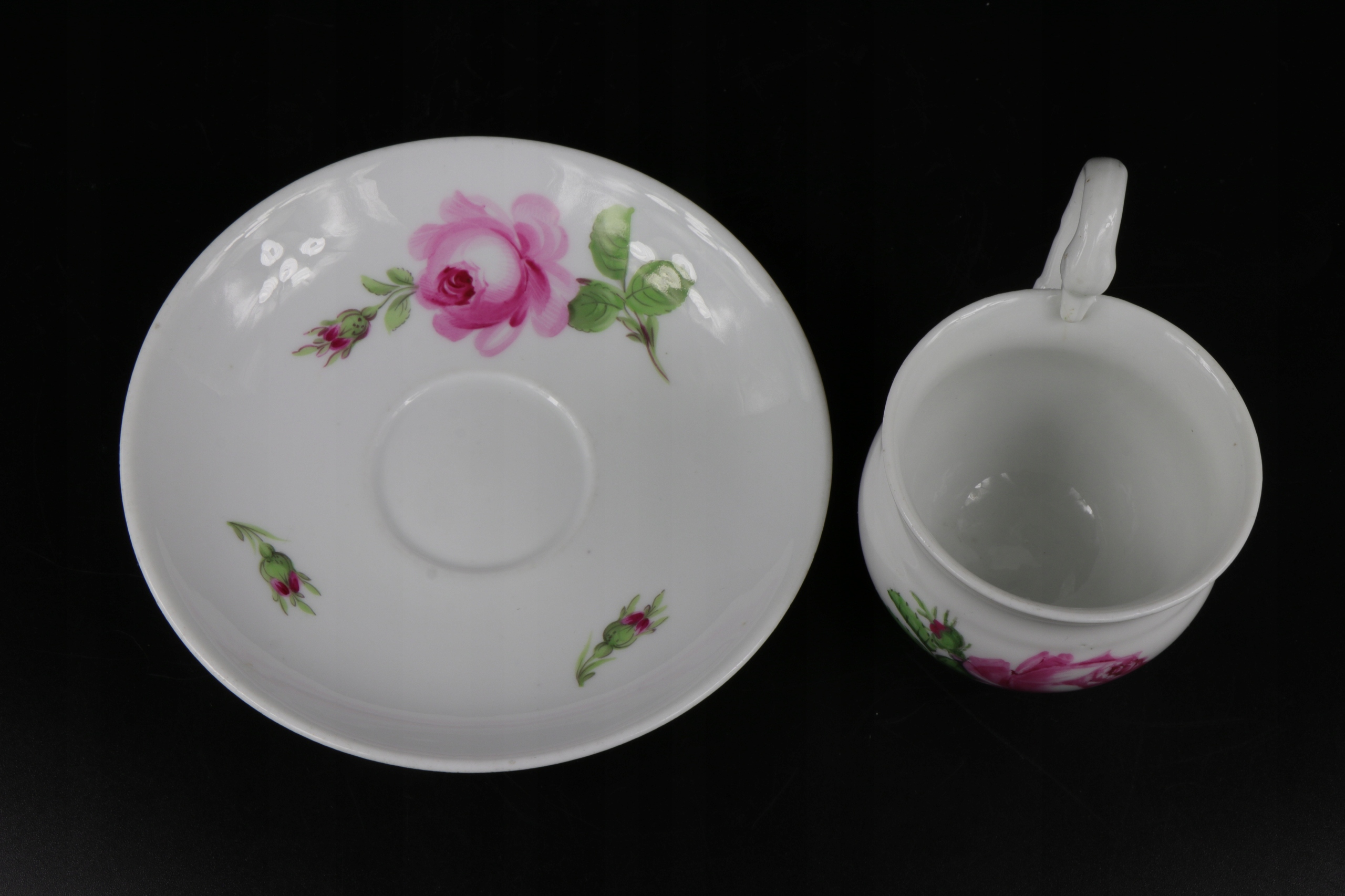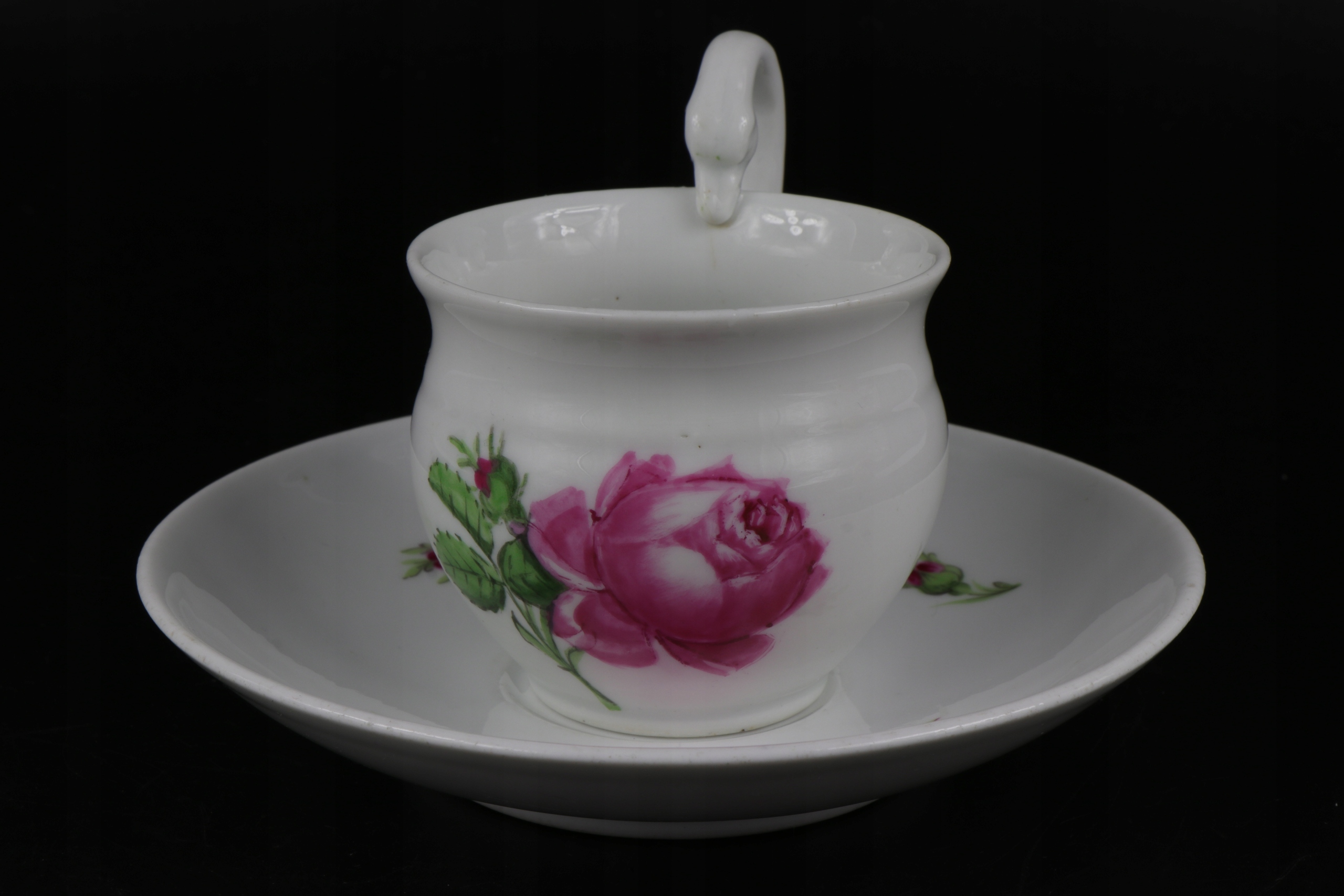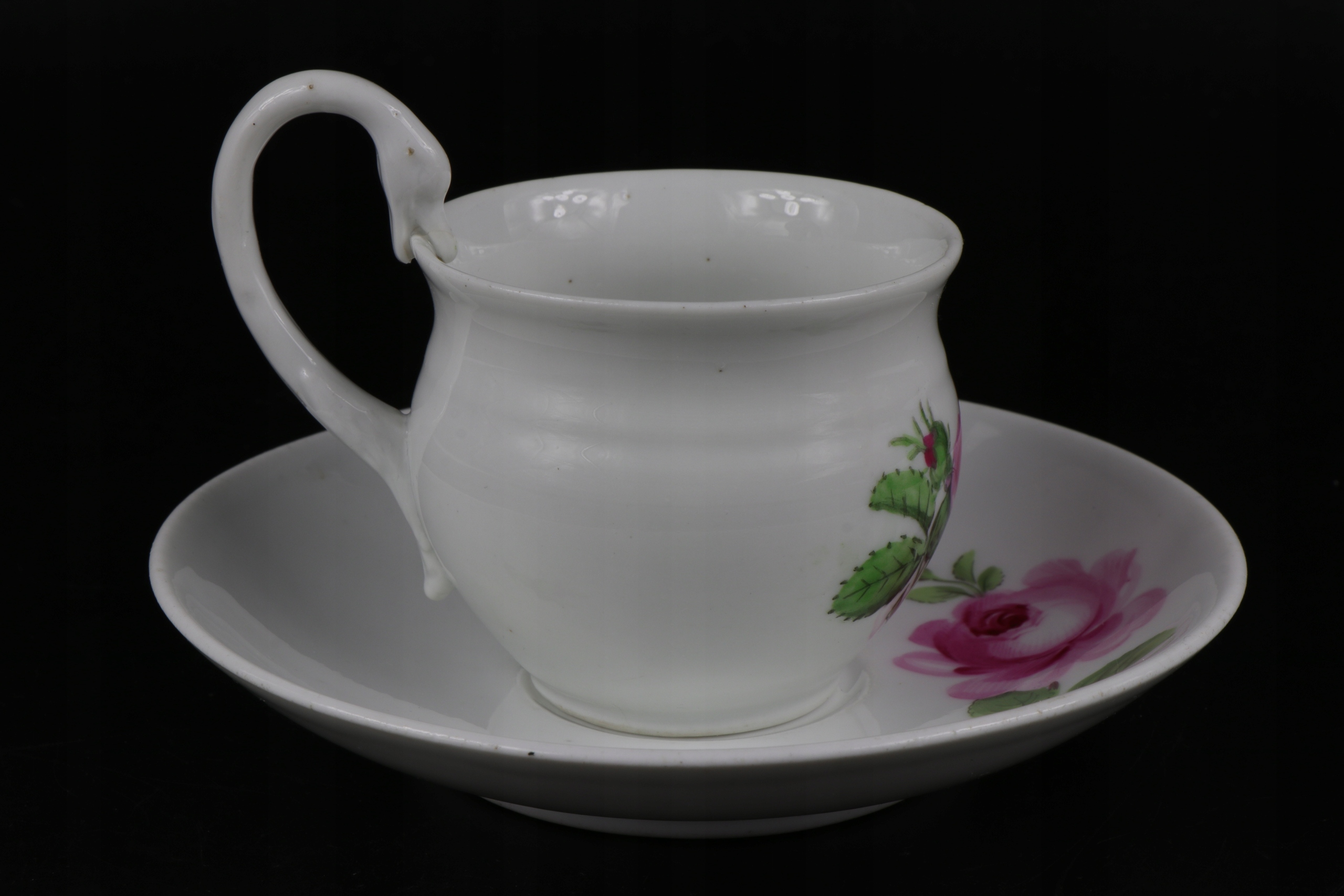 интересная кубок с рукой коллекционера в Мишнии со второй половины 19 -го века с красивым розовым орнаментом. Чашка уха в характерной эмпирической форме лебедей. Фарфор подписан на чашке и базовый кобальтовый знак двух скрещенных сабли.