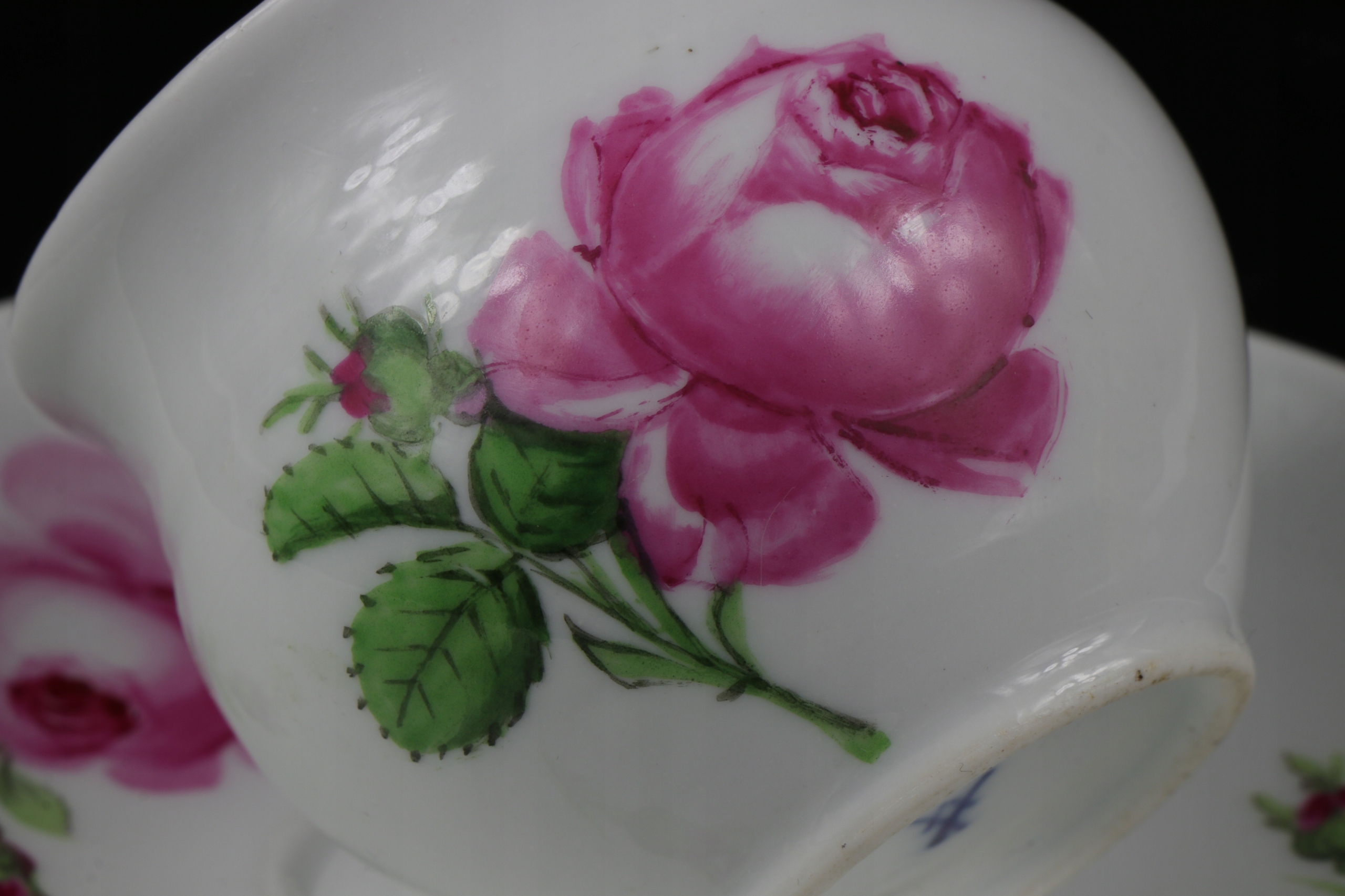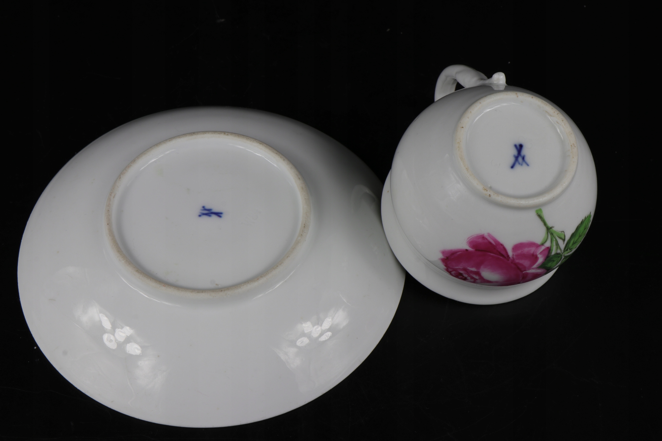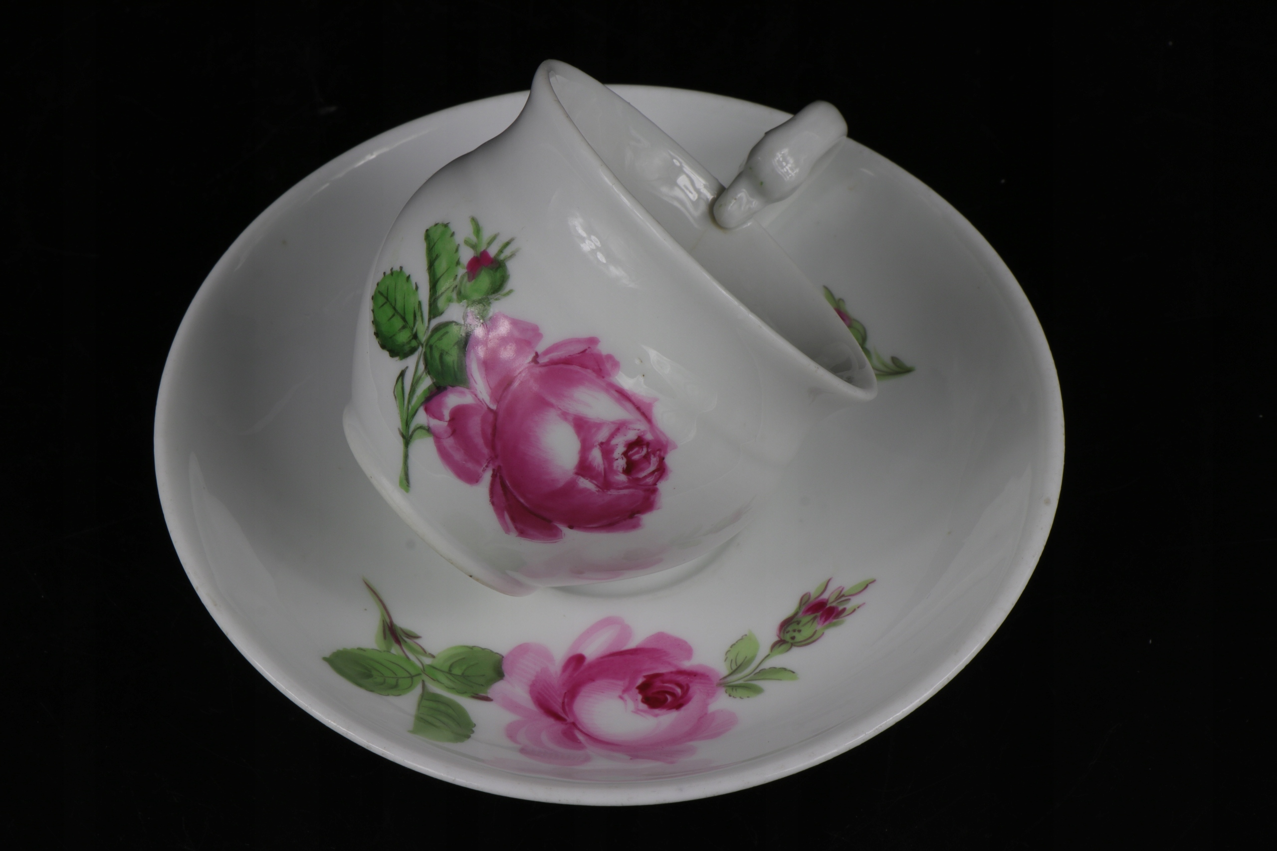 интересная кубок с рукой коллекционера в Мишнии со второй половины 19 -го века с красивым розовым орнаментом. Чашка уха в характерной эмпирической форме лебедей. Фарфор подписан на чашке и базовый кобальтовый знак двух скрещенных сабли.