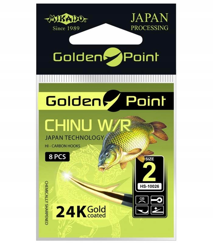 Golden Point – современные, исключительно прочные и гибкие крючки, изготовленные из углеродистой стали высочайшего качества, пригодные для ловли белой рыбы всеми способами. Лезвие каждого крючка подвергнуто точной химической заточке и покрыто гальваническим покрытием из 24-каратного золота. Золотое покрытие защищает сталь от окисления, и крючки остаются острыми очень долгое время. Golden Points с небывалой легкостью впиваются в пасть рыбы и позволяют успешно вываживать любую рыбу.