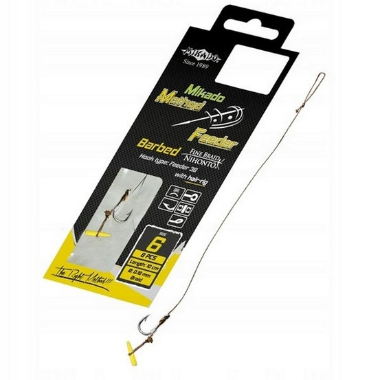 Короткий (10 см), привязанный к чрезвычайно мягкой и сильной точной косичке Микадо Нихонто в маскировании коричневого цвета, лидеры фидеров, специально предназначенные для рыбалки с «методом»