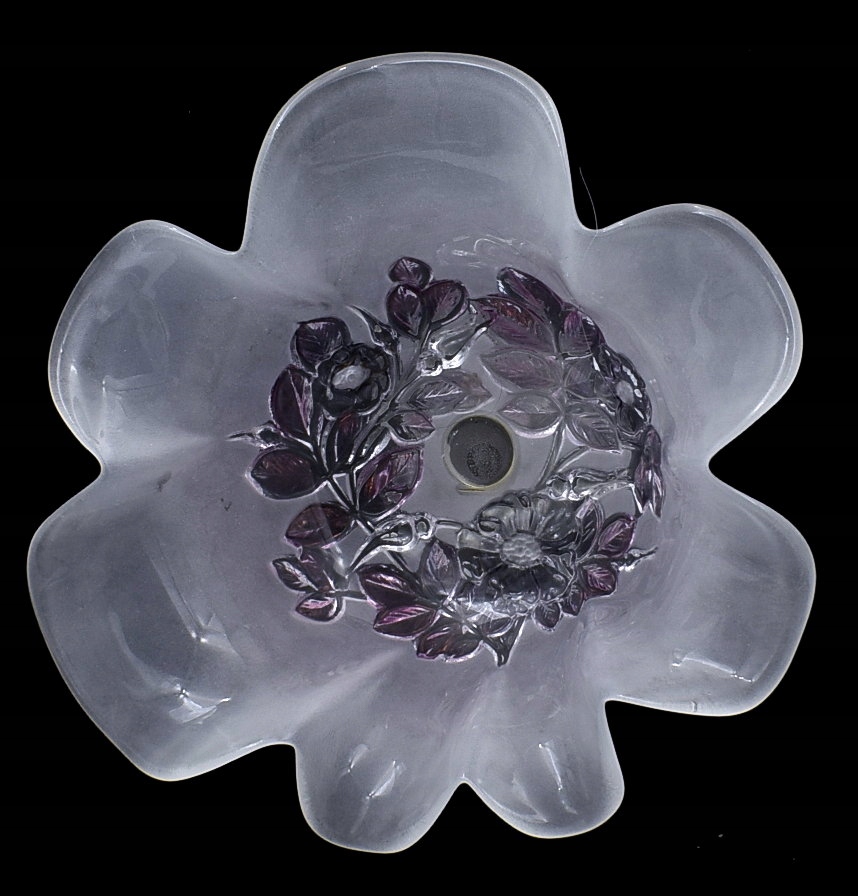 Предмет аукциона - чудесная тарелка, изготовленная из толстого бесцветного хрусталя, травленого с очень выпуклыми, красочными рельефами.