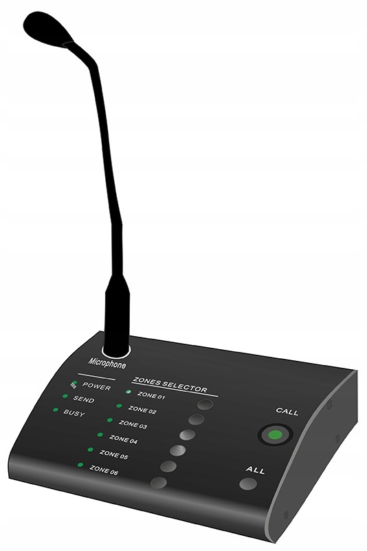 - это микрофон Grodzie, который поддерживает максимум 6 зон. Выбор зон, источника питания и состояния микрофона рекомендуется. Вы можете подключиться к 8 микрофонам к тандеме на расстоянии 1 км. Автоматический гонг, приоритет. Для подключения к JPA 1124, 1244, 1504 штаб -квартиру радиосвязи с кабелем STP и разъемом RJ 45.
