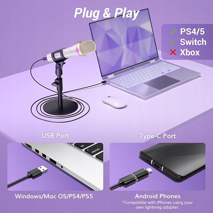 ⭐Подключи и работай и широкая совместимость: Этот динамический микрофон для подкастов создан для удобной работы — просто подключите его к компьютеру и начните запись. В комплект входит адаптер USB-Type C для совместимости со всеми компьютерами и телефонами Android. Удобный дизайн делает его отличным выбором для новичков, будь то игры, прямые трансляции или подкасты. (Примечание: совместимо с PS4/PS5 и Switch, но НЕ Xbox.)