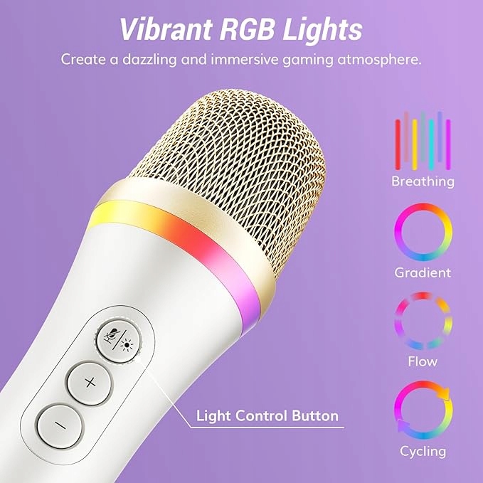 ⭐Яркая и регулируемая RGB-подсветка: USB-микрофон TD310 для ПК предлагает 5 режимов подсветки (дыхание, цикличность, градиент, поток и выключение света), которые подойдут к вашим игровым настройкам и создадут приятную игровую атмосферу. Нажмите и удерживайте кнопку управления освещением в течение 2 секунд, чтобы переключиться между режимами. Кольцо подсветки RGB имеет функцию памяти, исключающую повторные настройки. (При необходимости вы также можете выключить свет.)