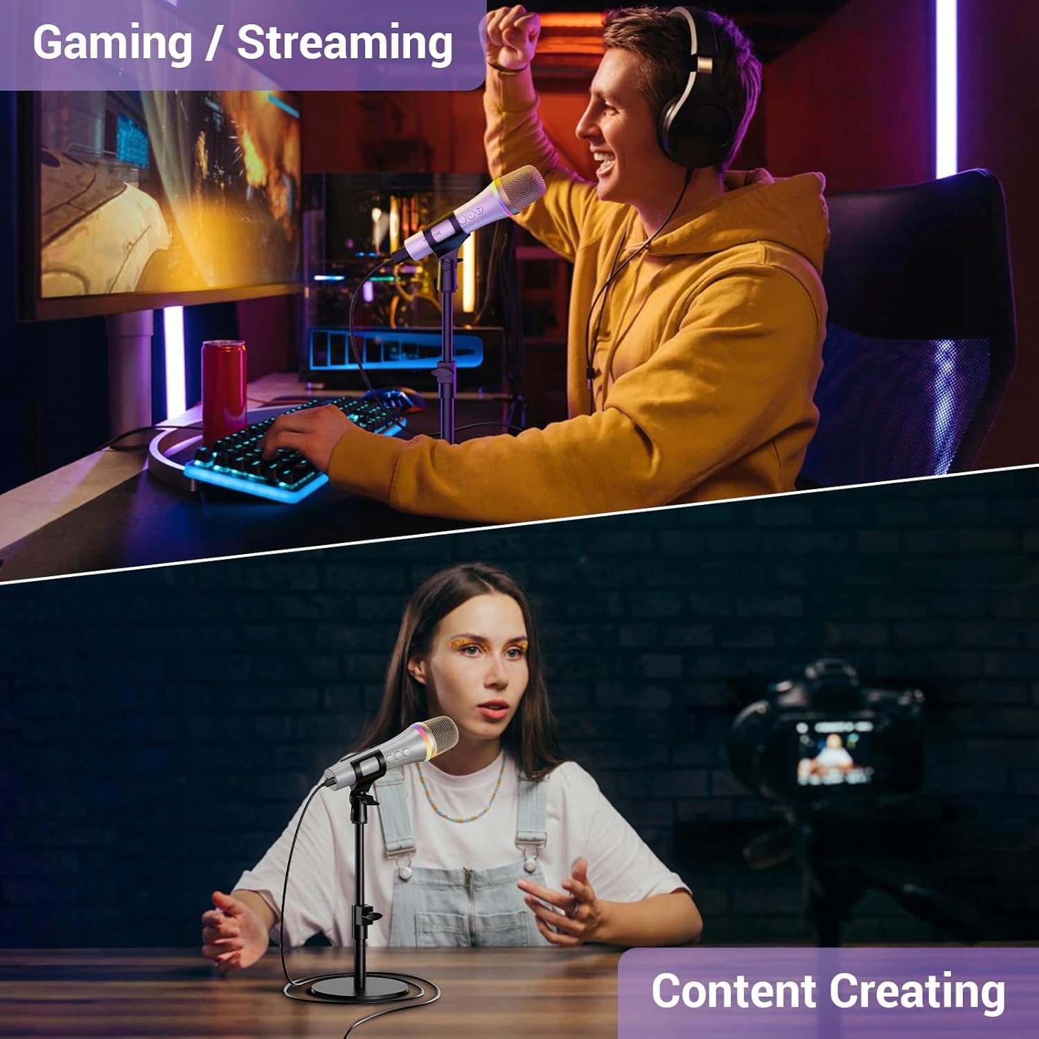 Динамический микрофон TONOR USB/Type C для ПК, компьютерный игровой микрофон для подкастов RGB с настольной подставкой для записи, прямых трансляций, потокового вещания, YouTube, пения, студии, караоке Микрофон с функцией быстрого отключения белого цвета