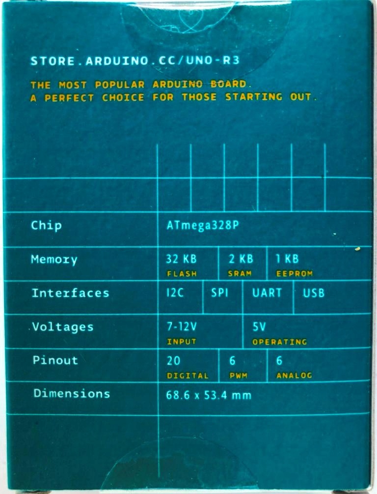 Arduino Uno Rev3 — модуль с микроконтроллером AVR ATmega328. Он имеет 32 КБ флэш-памяти, 2 КБ ОЗУ и 14 цифровых входов/выходов (6 из которых могут использоваться как каналы ШИМ с «широтно-импульсной модуляцией» и 6 являются аналоговыми входами). Это устройство рекомендуется как опытным инженерам-электронщикам и робототехникам, так и начинающим любителям электроники DIY.