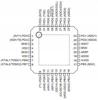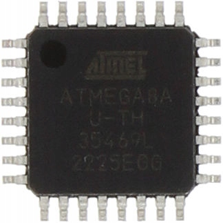 Маленький, высокопроизводительный и энергосберегающий микроконтроллер ATMEL в 32-контактном корпусе SMD. Питается напряжением от 2,7 В до 5,5 В, тактируется с сигналом до 16 МГц. Флэш-память 8 КБ с возможностью чтения и записи, ОЗУ 1 КБ, EEPROM 512 байт. Имеет программируемый сторожевой таймер с внутренним генератором, последовательный порт SPI и пять программно выбираемых режимов энергосбережения.
