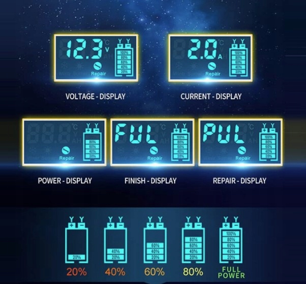 Подходит для аккумуляторов 6 В и 12 В, работает с SLA, WET, MF, FLOODED, GEL, VRLA, AGM. , EFB, а значит, его можно использовать для аккумуляторов автомобилей, мотоциклов, лодок, газонокосилок, сельскохозяйственной техники и других.
