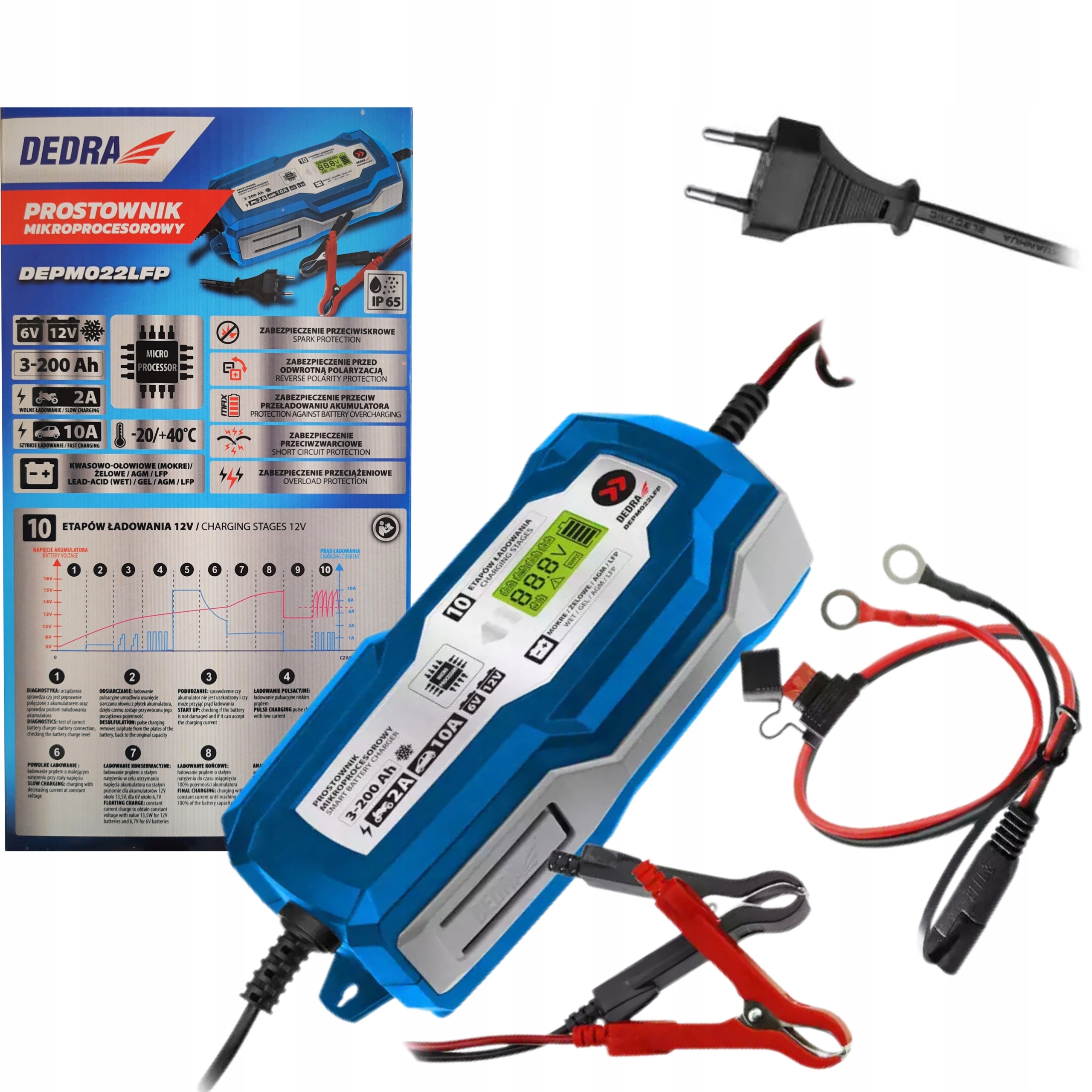 Выпрямитель DEDRA DEPM022LFP представляет собой устройство, предназначенное для зарядки свинцово-кислотных (мокрых), гелевых, AGM, LFP аккумуляторов напряжением 6/12В и емкостью 3-200 Ач, которые используются в мотоциклах, легковых автомобилях и т.п.