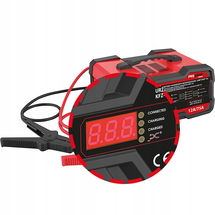 ➡️ После подключения зажимов к аккумулятору и устройства к сети на дисплее отображается информация «Подключено». При выборе режима зарядки появляется сообщение «Зарядка». Когда зарядка завершится, появится сообщение «Заряжено». Если на дисплее отображается «0,0» до того, как аккумулятор полностью заряжен, произошла ошибка.