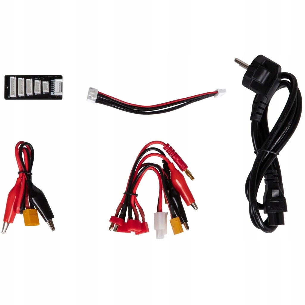 В комплект входят: зарядное устройство, кабель питания, переходник-балансир и кабели: адаптер-балансир, зажимы-крокодилы - XT60, зажимы-крокодилы - Deans F, адаптер Deans - Tamiya большой, Deans - XT60, штифт - Deans M.