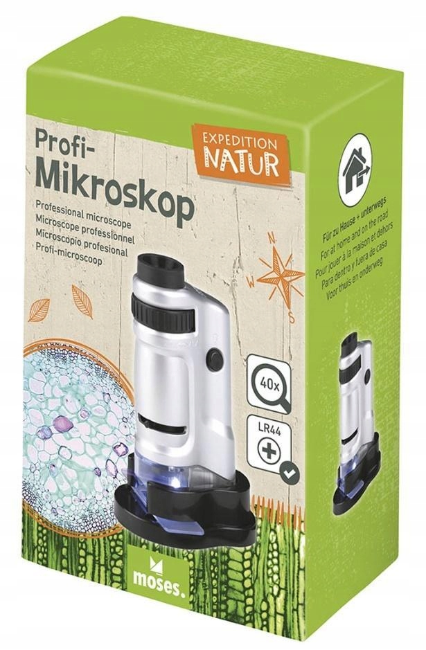 Профессиональный микроскоп для повседневного использования из коллекции Expedition Natur. Мы можем использовать его дома и в полевых условиях. Благодаря удобному размеру он поместится в любой карман куртки! Он позволяет наблюдать мельчайшие объекты, регулируя фокус с помощью ручки. Увеличение от 20 до 40 раз. Содержит 2 предметных стекла и 2 покровных стекла. В комплект входят 3 батарейки LR 44.