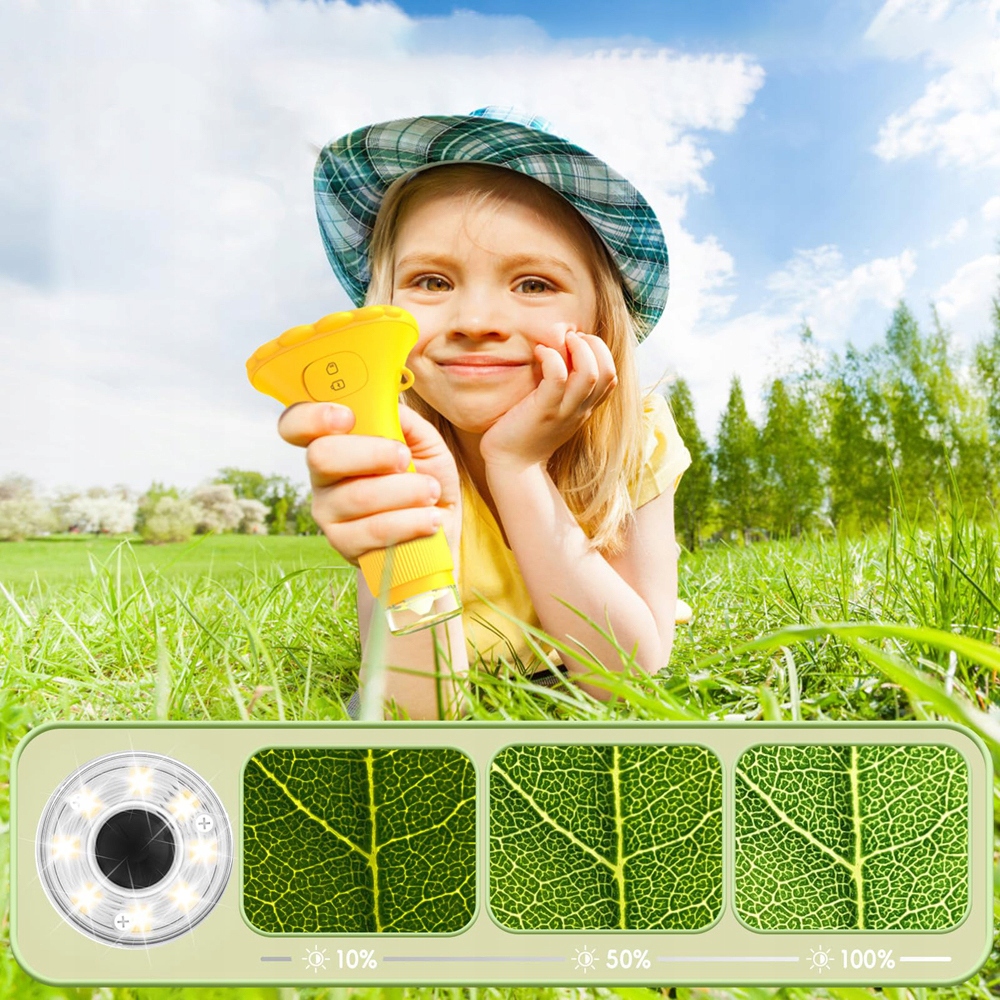 Детский микроскоп оснащен 8 светодиодными лампочками с регулируемой яркостью.