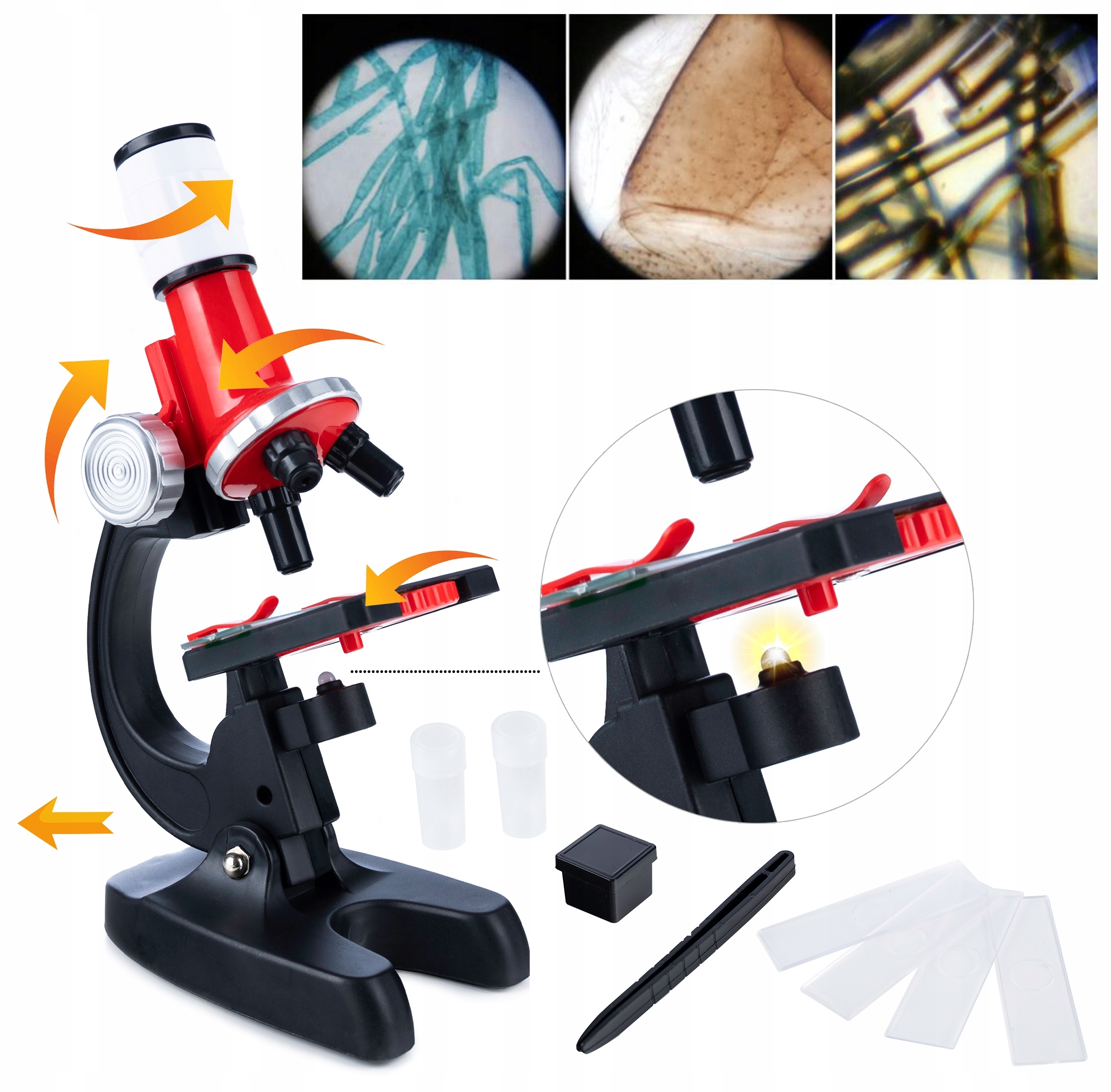 УЧЕБНО-НАУЧНЫЙ МИКРОСКОП ДЛЯ ДЕТЕЙ - УВЕЛИЧЕНИЕ 100x/400x/1200x - СО СВЕТОДИОДНОЙ ПОДСВЕТКОЙ, НА АККУМУЛЯТОРЕ + АКСЕССУАРЫ