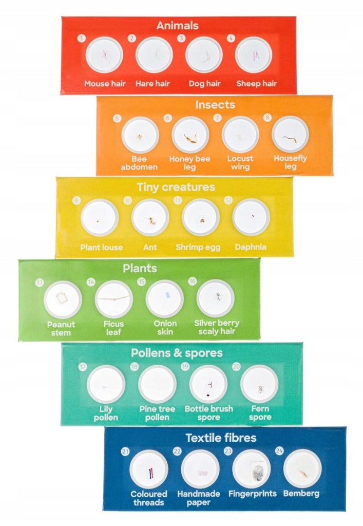 Все препараты разделены на шесть групп. Каждый препарат относится к одной из групп, состоящих из четырех препаратов. Все препараты отмечены так, чтобы вы могли легко найти тот, который хотите протестировать. Чтобы начать тестирование, просто положите образец на стол, отрегулируйте фокус и интенсивность освещения (при необходимости) – и все! Используйте этот набор, чтобы узнать больше о микромире.