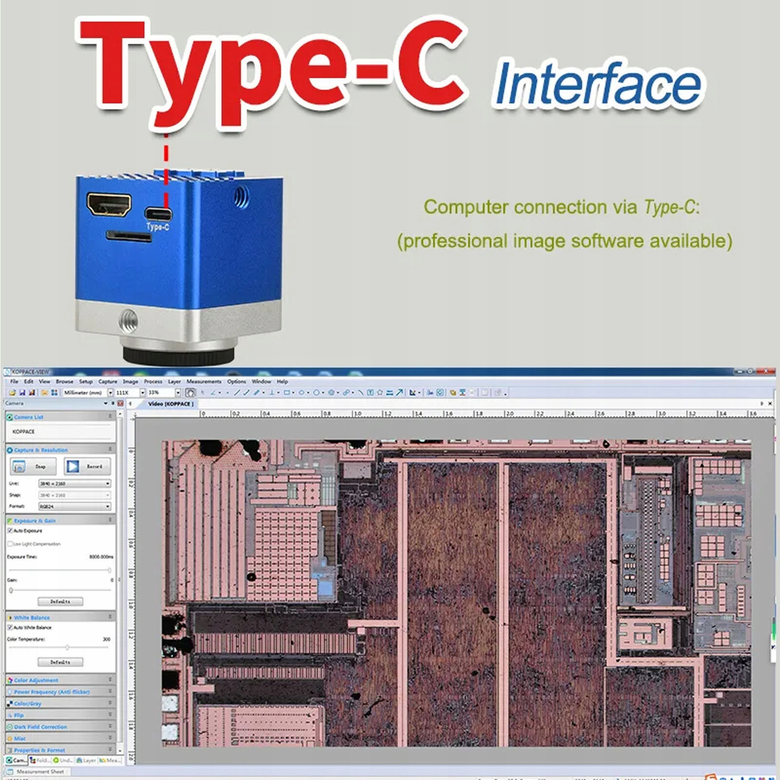 1. Датчик CMOS с высоким разрешением: оснащен CMOS -датчиком изображения 8,3 Мп 1/ 1,8 дюйма CMOS, эта камера микроскопа в видеоиндустрии обеспечивает превосходное качество изображения как для фотографии, так и для записи видео, предоставляя подробные и живые визуальные элементы.