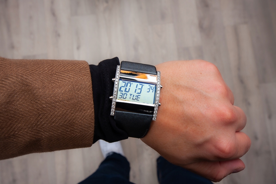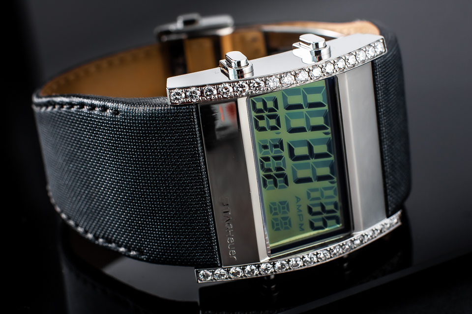 в виде цифрового дисплея. На лицевой стороне часов подписано название бренда «TAG Heuer».