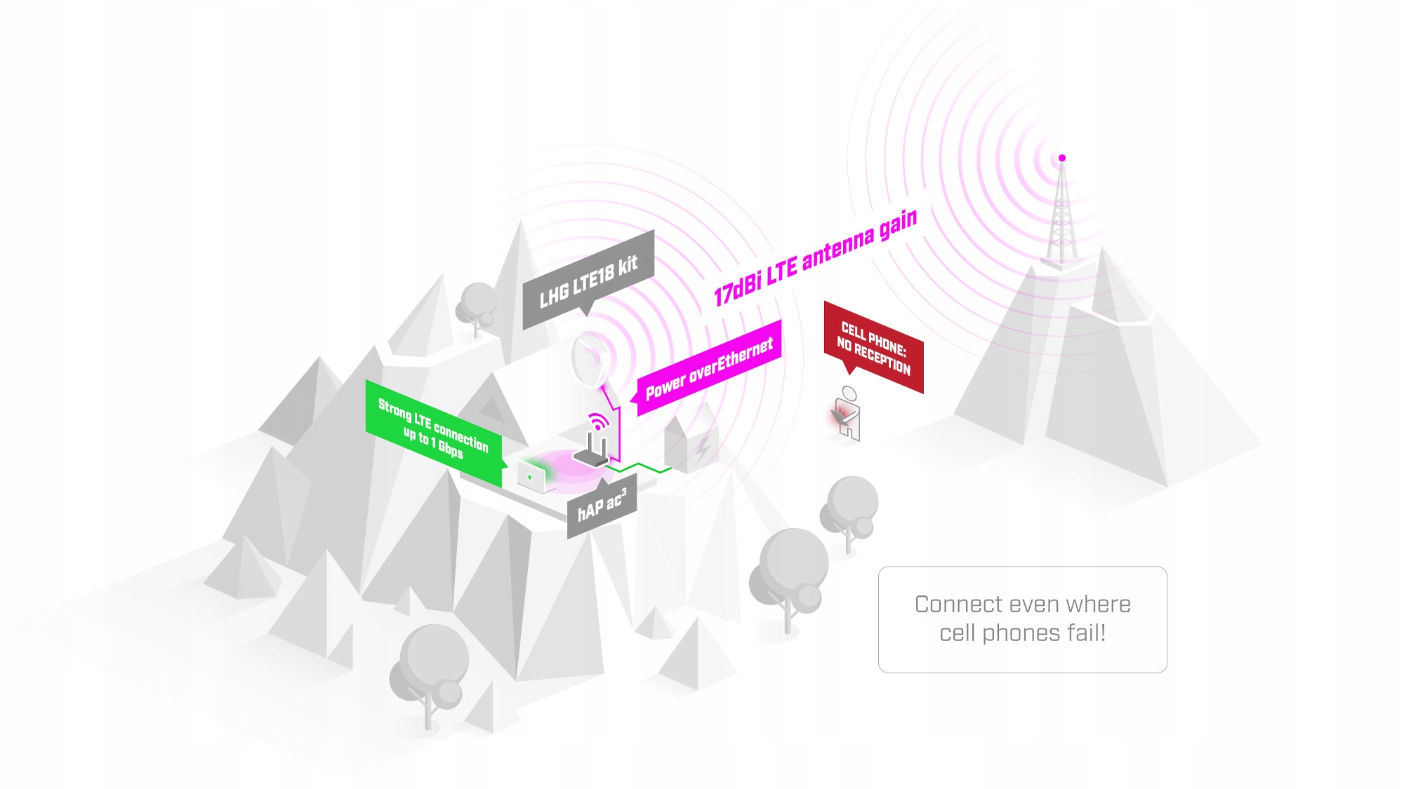 Как и предыдущие модели LHG LTE, это Интернет-решение последней мили для ситуаций, когда даже на вашем телефоне может не быть сигнала. Новый LHG оснащен современным модемом LTE категории 18, обеспечивающим самый быстрый мобильный Интернет, где бы вы ни находились. Этот комплект поддерживает скорость до одного Гбит/с! Благодаря большой антенне с высоким коэффициентом усиления 17 дБи комплект LHG LTE18 может подключаться к вышкам сотовой связи в отдаленных сельских районах, где ничего другого недоступно.