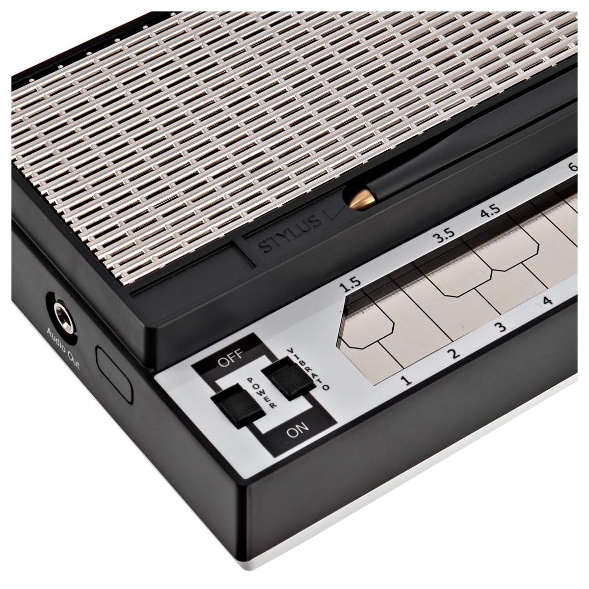 Стилофон шириной менее 12 см легко помещается в пальто. карман. Он работает от 3 батареек типа АА и имеет встроенный динамик и разъем для наушников, поэтому вы можете играть где угодно.
