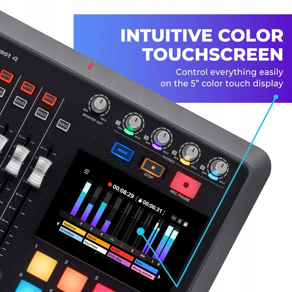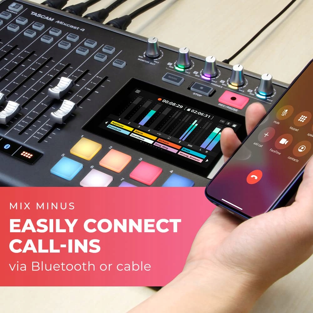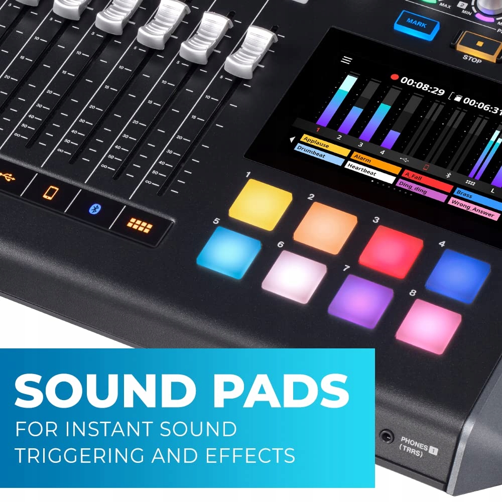 Микшер Tascam Mixcast 4 также прост в использовании. Просто коснитесь 5-дюймового (12,7 см) сенсорного экрана, чтобы выполнить большинство операций. Триггерные пэды позволяют воспроизводить эффекты и джинглы.