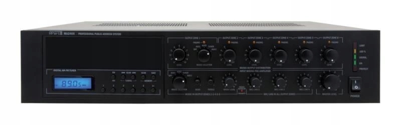 6-зонный мощный микшер 100 В + цифровой тюнер AM/FM, 6 полностью независимых звуковых зон, выходная мощность 240 Вт RMS, регулировка громкости в каждой зоне, 4 линейных входа + 3 микрофонно-фантомных входа, 6-зонная пейджинговая система< /п>