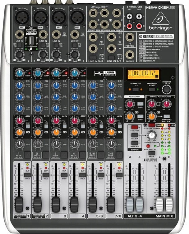 Сверхмалошумящий аналоговый микшер XENYX QX1204USB с процессором KLARK TEKNIK FX, 4 микрофонными предусилителями XENYX и индивидуальным PHANTOM-питанием.