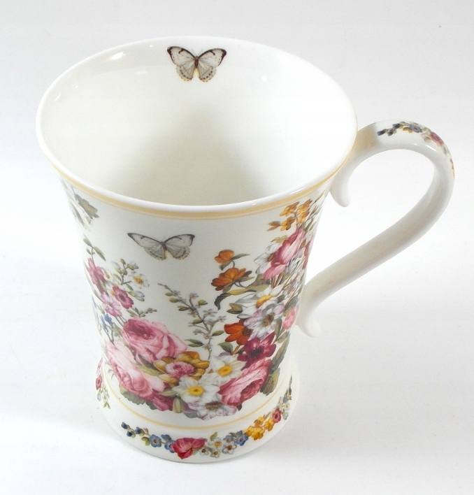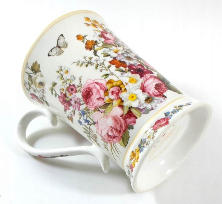 Красивая, высокая кружка из белого фарфора, украшенная цветами и бабочками.