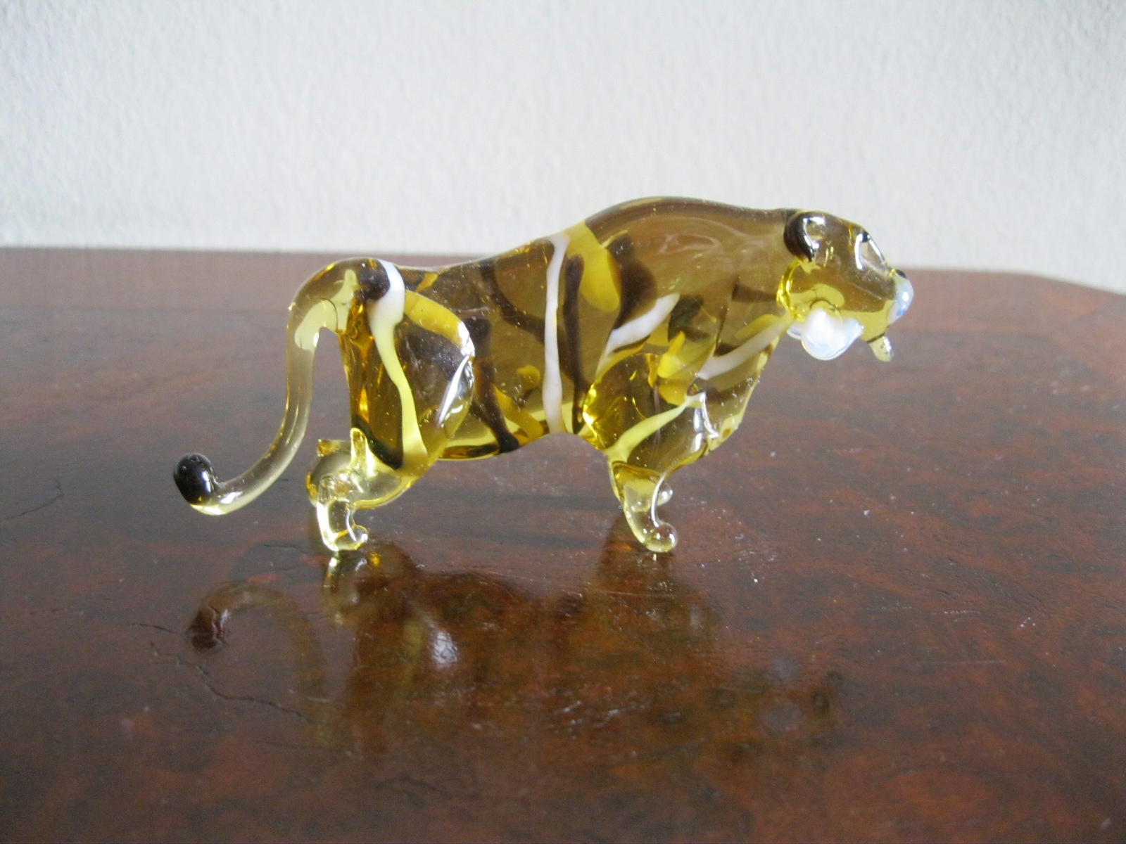Красивая, старинная, стеклянная, филигранная статуэтка - Тигр. Очень декоративен. Изготовлен из стекла медово-желтого цвета. Прекрасно стилизованная форма, изображающая стоящего тигра. Сохранился в очень хорошем состоянии, полностью неповрежденный. Идеально подходит для украшения или в качестве подарка. Рекомендую!