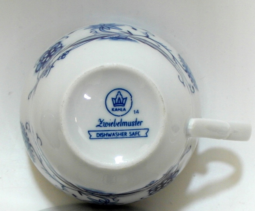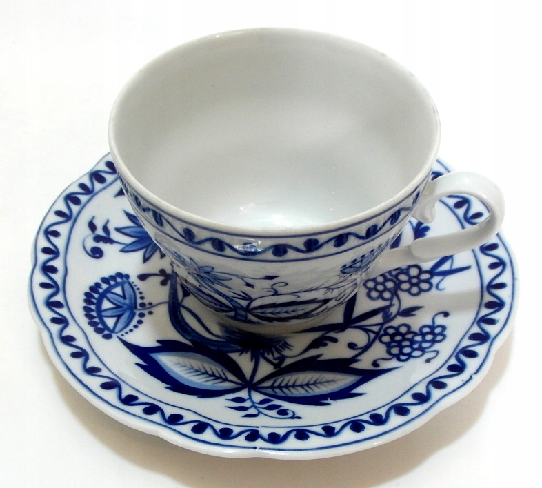 Красивая, старинная чашка из белого фарфора, украшенная кобальтовым узором в виде луковицы.