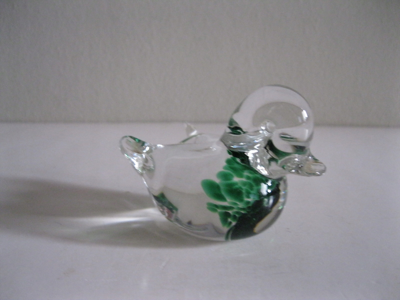 Красивая, старая, стеклянная, коллекционная фигурка утки среднего размера. Очень декоративен. Изготовлен из белого прозрачного стекла с зелеными вкраплениями. Очень красиво оформленная форма. Сохранился в очень хорошем состоянии, полностью неповрежденный. Идеально подходит для украшения. Рекомендую!