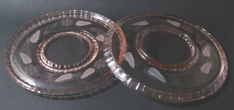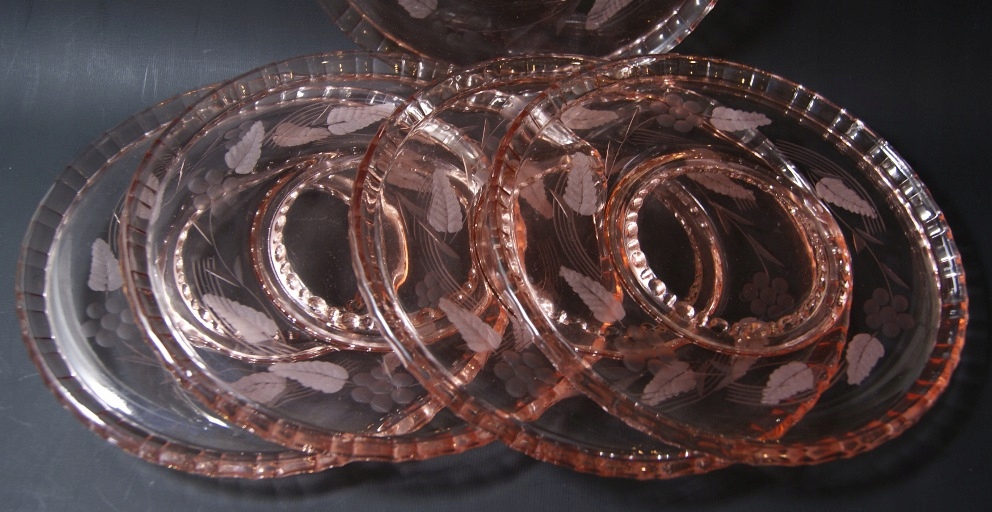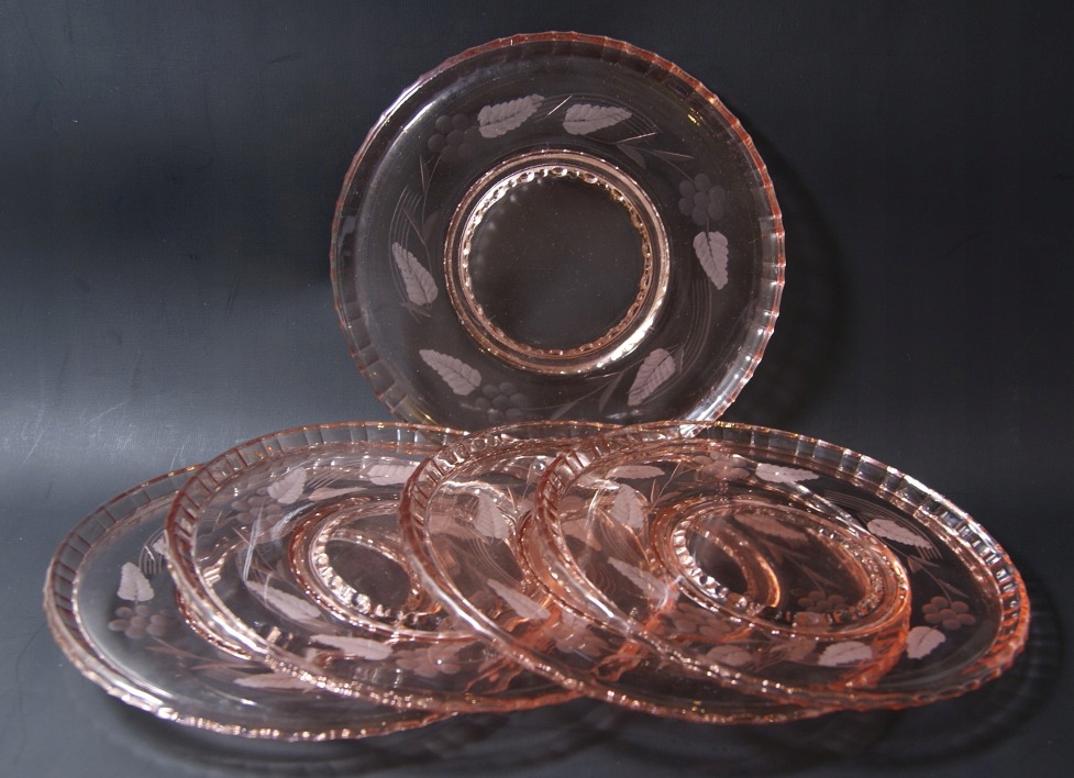 Предмет аукциона - красивый, старинный набор десертных тарелок - 5 штук, выполненных из толстого розово-лососевого хрустального стекла.