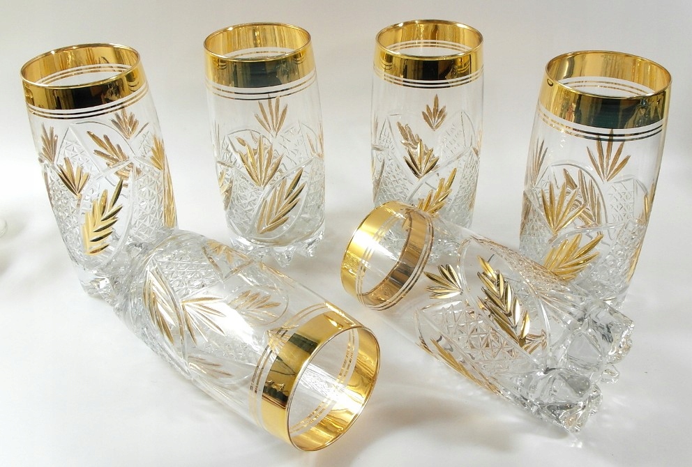 Красивые, старинные, массивные бокалы - набор из 6 штук, из толстого бесцветного хрусталя, глубокий, позолоченный узор..