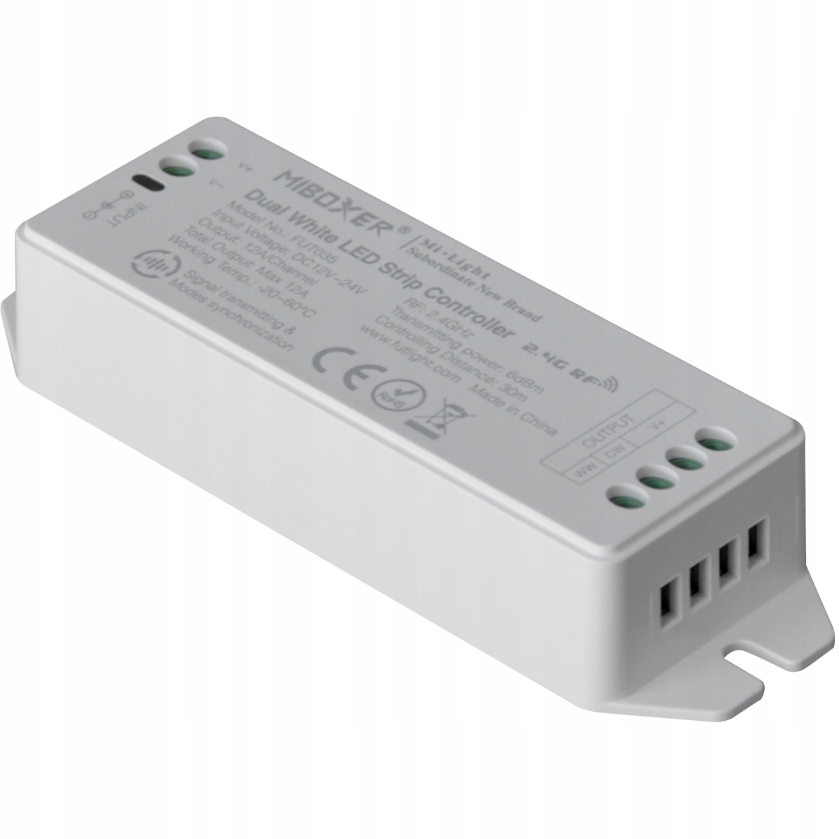 Фирменный зонный радиоконтроллер MiLight FUT035, предназначенный для управления двухцветными светодиодными лентами CCT, с напряжением питания 12-24В постоянного тока. С помощью этих контроллеров и 4-зонного пульта MiLight можно создать до 4 зон светодиодного освещения и управлять этими зонами одновременно или независимо. Система позволяет изменять цветовую температуру света (при использовании соответствующей ленты), затемнять или увеличивать его яркость, работать в ночном режиме, а также позволяет управлять им с помощью смартфона или планшета с Android или iOS после использования Wi-Fi-роутер MiLight). К каждой зоне можно подключить неограниченное количество контроллеров, и в данной зоне они будут работать одинаково. Это позволяет исключить использование усилителей в более длинных установках. Драйверы и пульт дистанционного управления требуют синхронизации перед первым использованием.