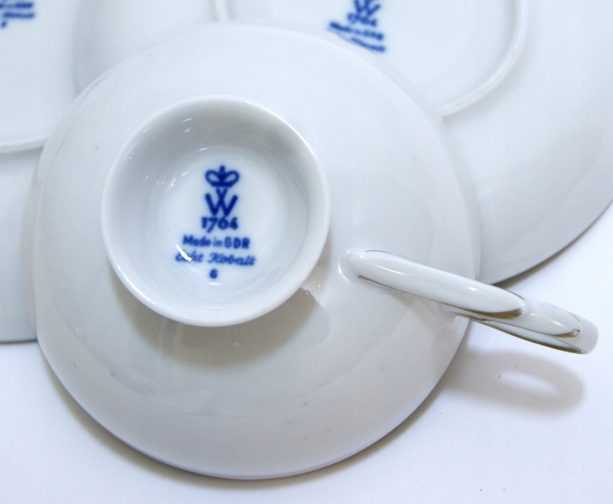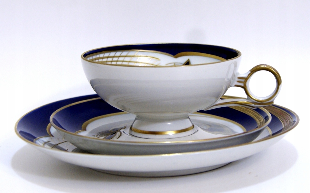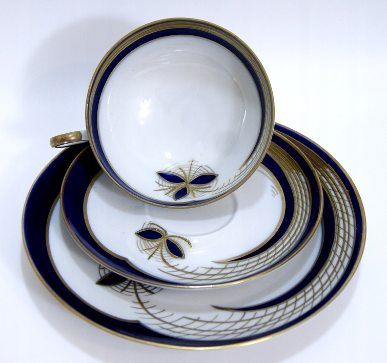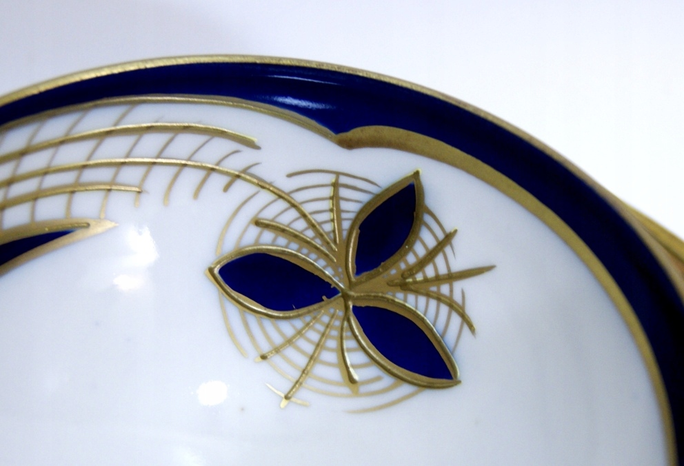 Предмет аукциона — красивый старинный сервиз для завтрака. Белый фарфор цвета кобальта, украшенный рельефно-выпуклым золотом. Валлендорф.