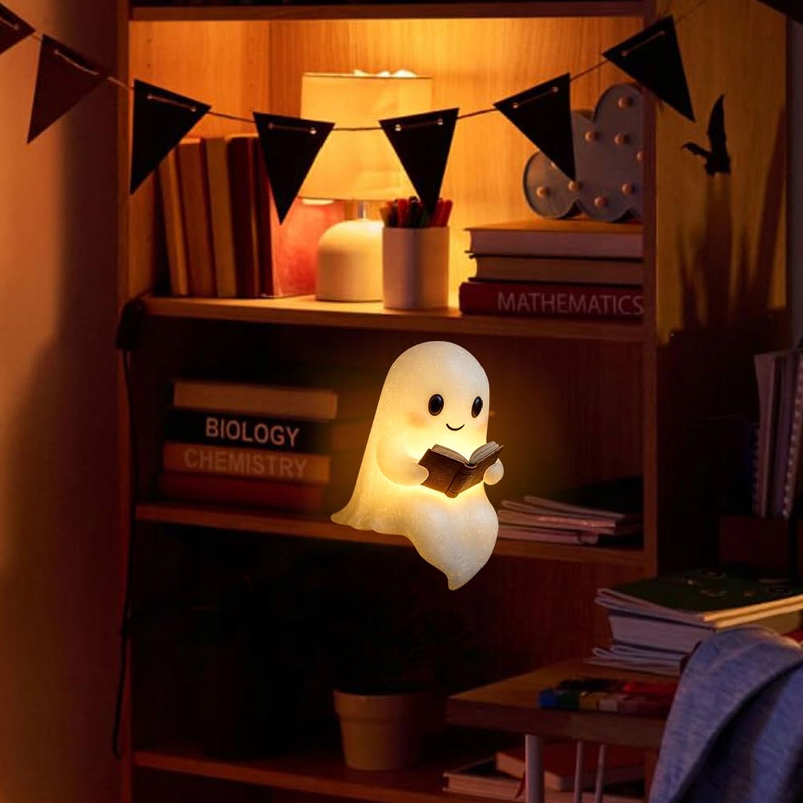 4. Питание от батареи. Эта очаровательная настольная лампа-призрак работает от батареи и обеспечивает удобство беспроводного подключения, что позволяет разместить ее где угодно, что делает ее отличным выбором для праздничного подарка.