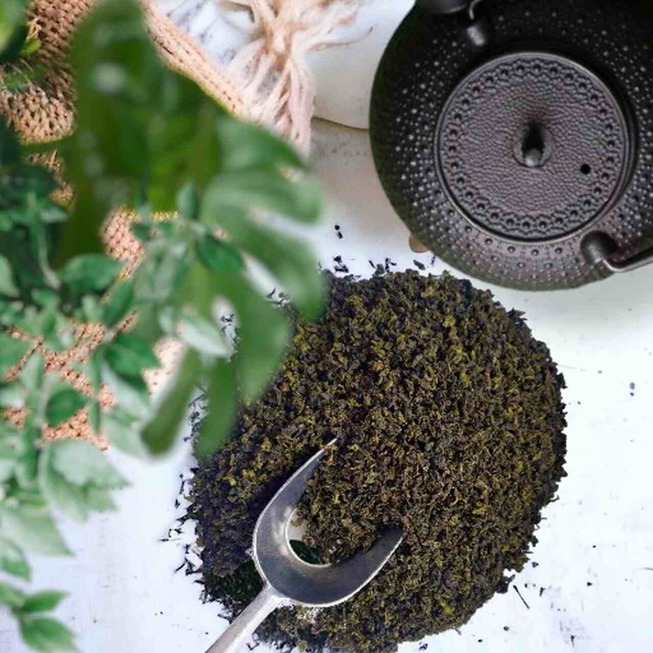избивает вручную), что приводит к нарушению структуры листьев. Эти листья все время от урожая подвергаются окислению, которое прерывается путем нагревания их при высокой температуре. Затем они формируются (плотно свернуты в шарики) и снова высушены. Окисление не очень большое, потому что зеленый цвет листьев все еще сохраняется, а инфузии ясны.