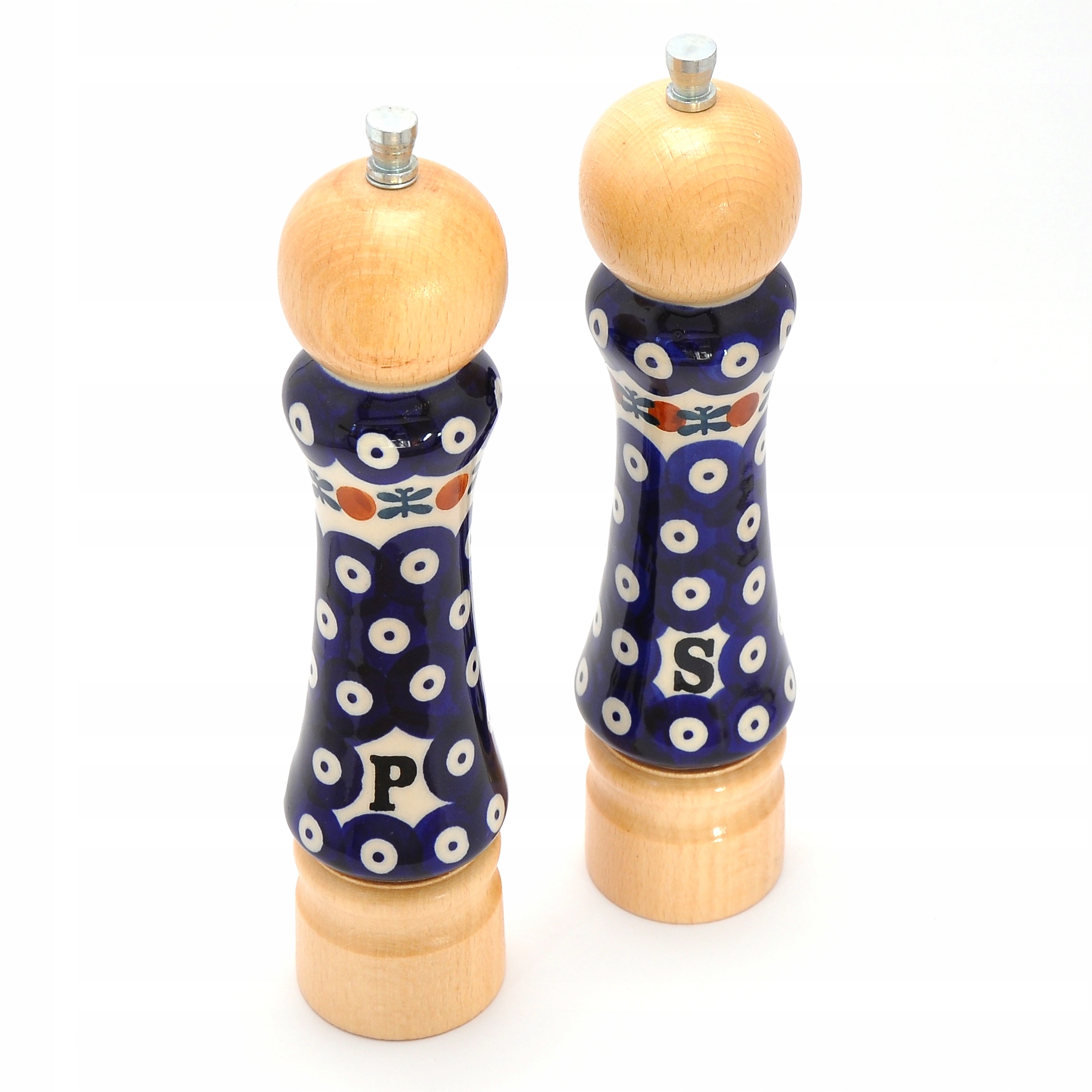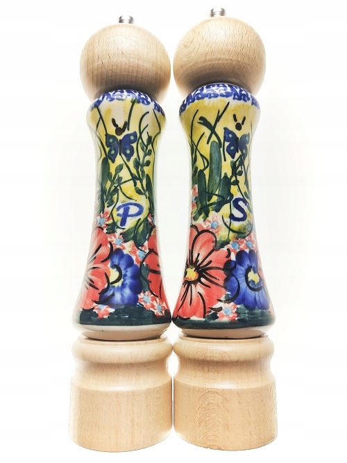 Набор производственных мельниц предназначен для измельчения перца и грубых соли. Это со вкусом и функциональным дополнением к декору любой кухни. Набор состоит из двух мельниц; Beech Wood завершен керамикой, импортированной из студий Bolesławiecki. Высококачественный механизм шлифовального сплава алюминиевого сплава ответственен за шлифование специй. Спасибо