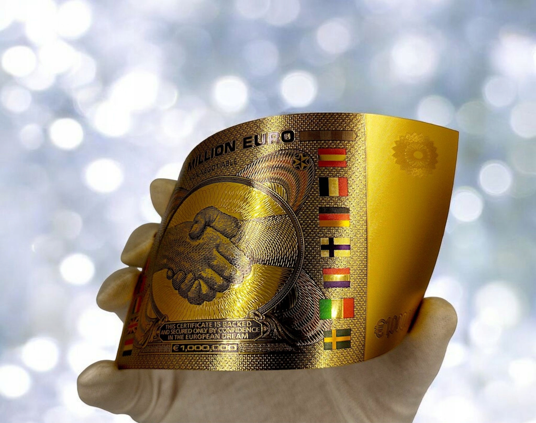 "Этот сертификат подкреплен и защищен только уверенностью в европейской мечте" - что делает данное изделие еще более оригинальным и наполненным сообщение.
