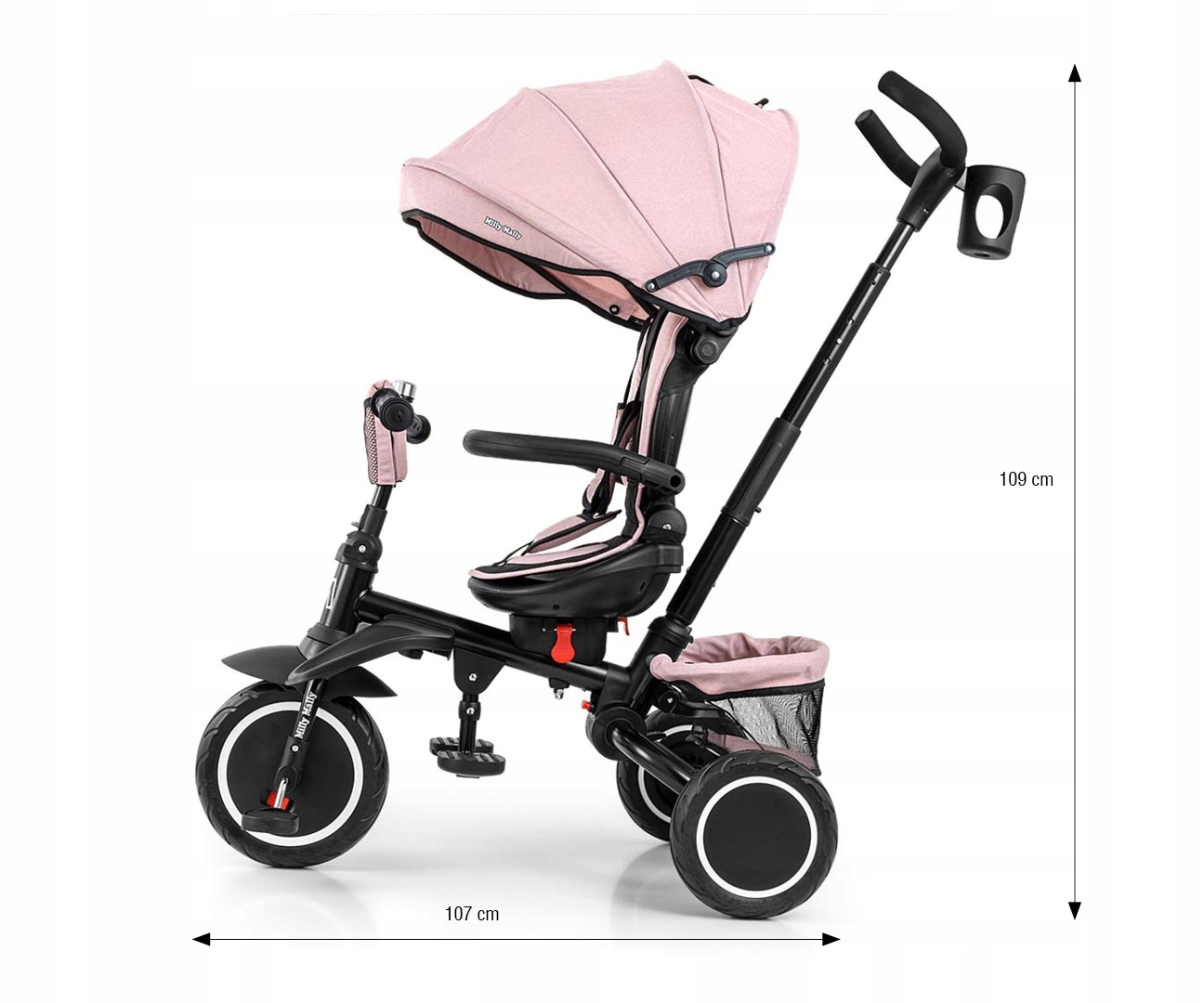 Велосипед был оснащен барьером, который защищает ребенка от выпадения, трех точечных ремней сиденья и двумя наборами ног. Целое дополняется резиновыми колесами, обеспечивающими адекватное сцепление и тихое и удобное вождение на каждой поверхности. Удобное и контурное сиденье обеспечит комфорт во время каждого путешествия, а складная крыша защитит ребенка от избытка солнца в жаркие дни.