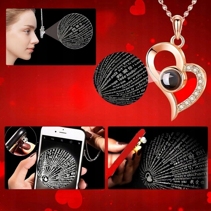 Чтобы отобразить признание в любви на 100 языках, поместите фонарик на заднюю часть ожерелья и направьте свет на любую плоскую поверхность, например на плоскую поверхность. стена. Самый эффектный эффект достигается при выключенном свете.
