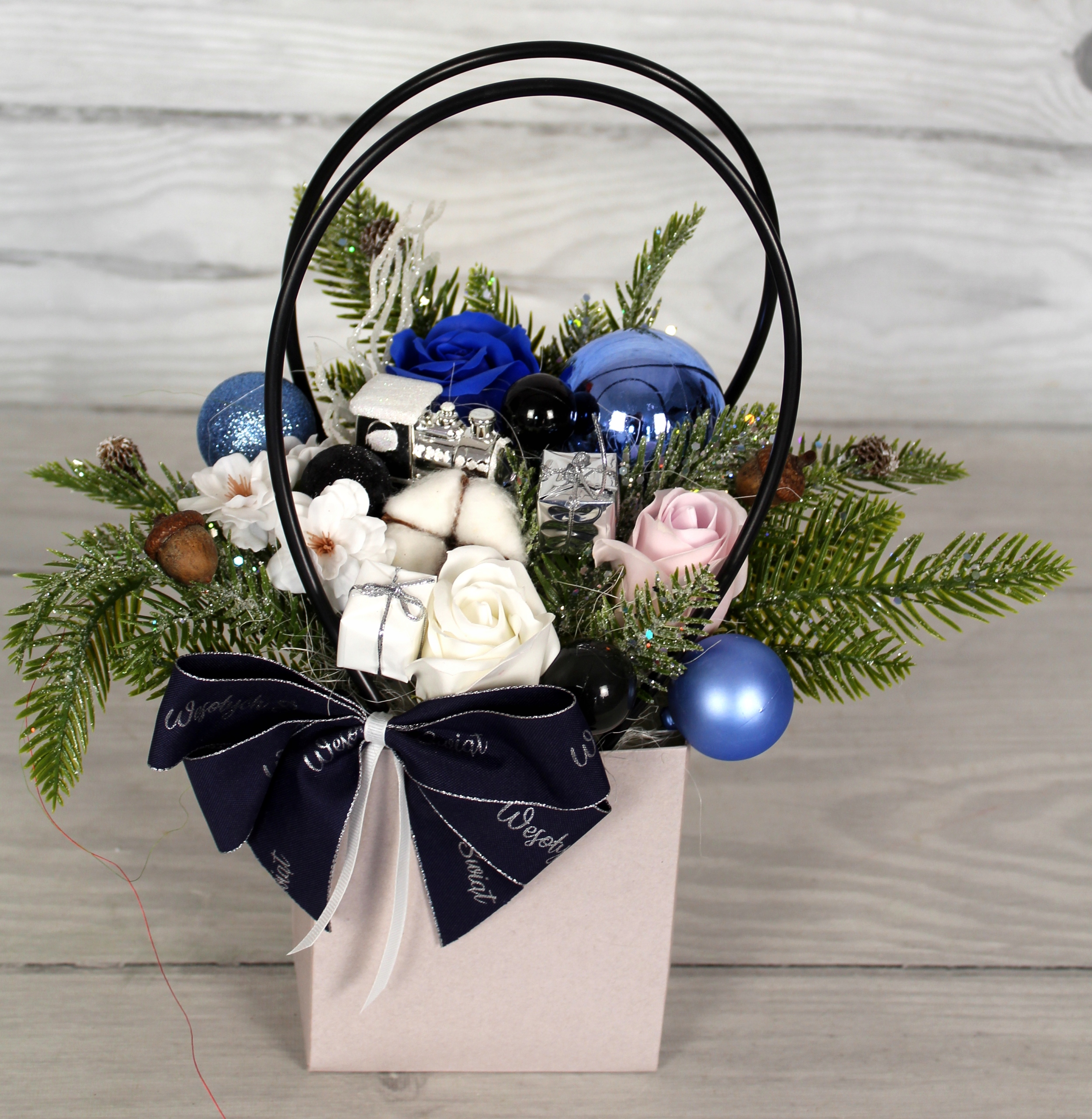 Новогоднее украшение красиво украсит любой интерьер. Он станет украшением вашего кабинета, офиса, дома и подарком близким. Цветы, которые помещаются в коробку, представляют собой мыльные цветы.