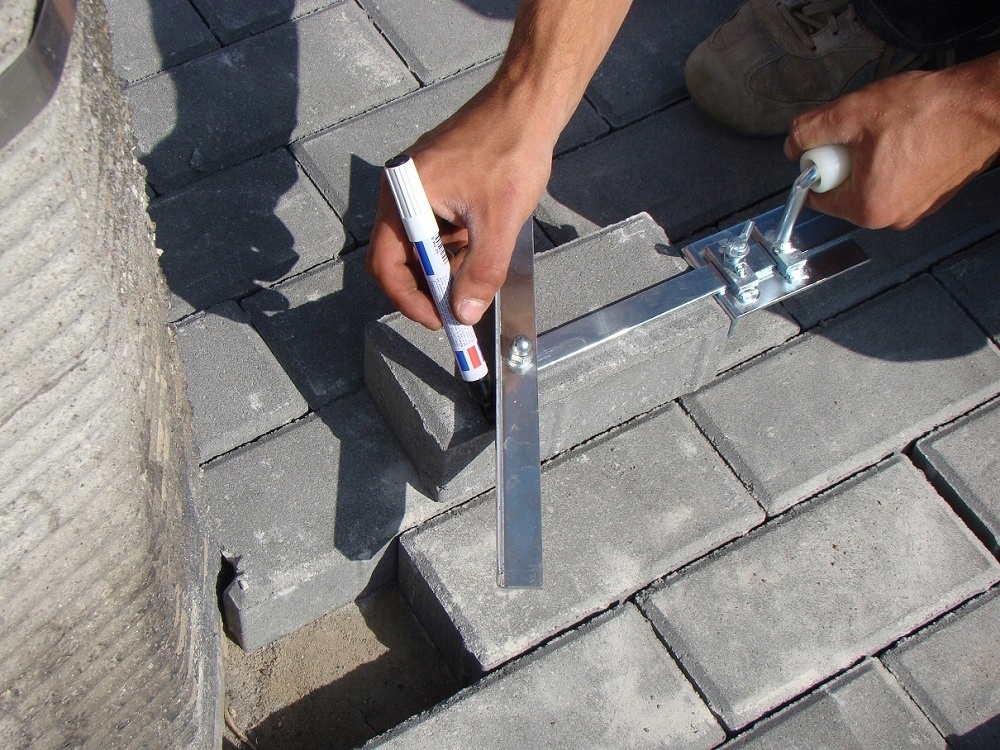 Линейка для укладки брусчатки ПРЗ отличается высоким качеством. и высокая эстетика. На фотографиях ниже показано, как легко с помощью нашего устройства можно выполнять работы, связанные с разметкой и резкой брусчатки под разными углами.
