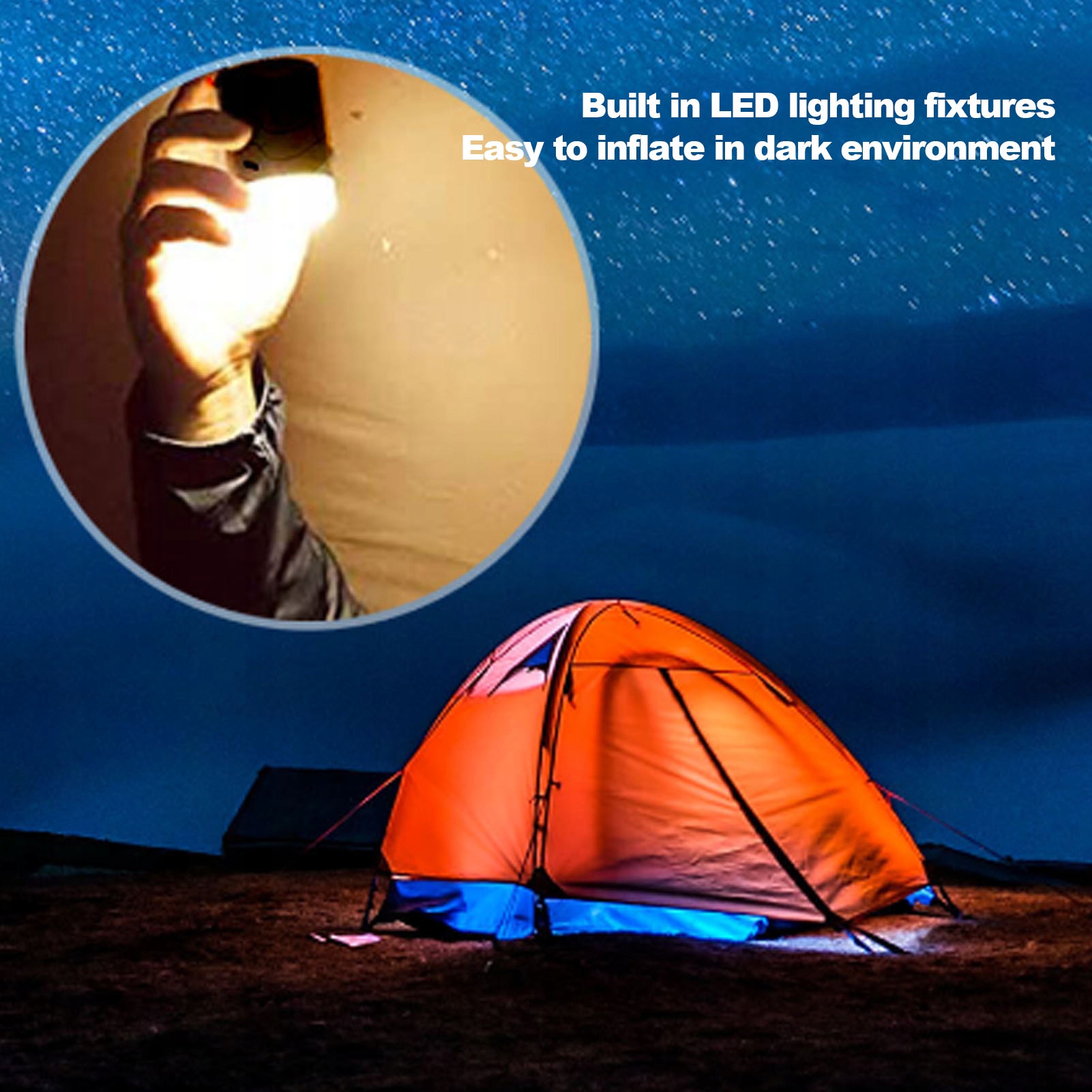 3. Встроенное светодиодное освещение: портативный воздушный насос оснащен встроенным светодиодным светом для ночного использования. Обеспечивает освещение в условиях низкого освещения, что делает его идеальным для кемпинга и на открытом воздухе ночью.
