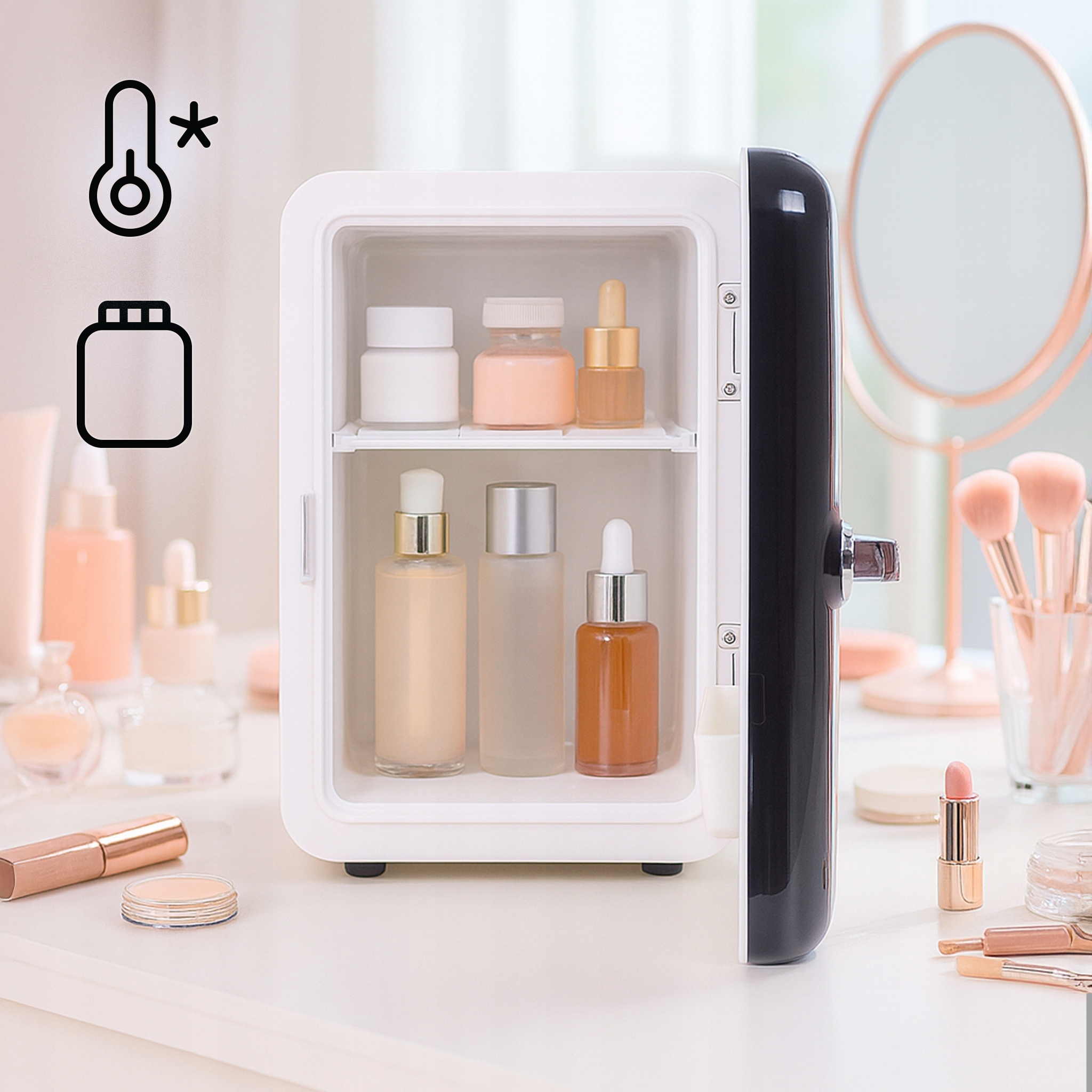 Не только практическое устройство для хранения напитков и закусок. Благодаря функции поддержания стабильной температуры , она также работает как холодильник Beauty - идеальное место для вашей косметики и продуктов ухода.
