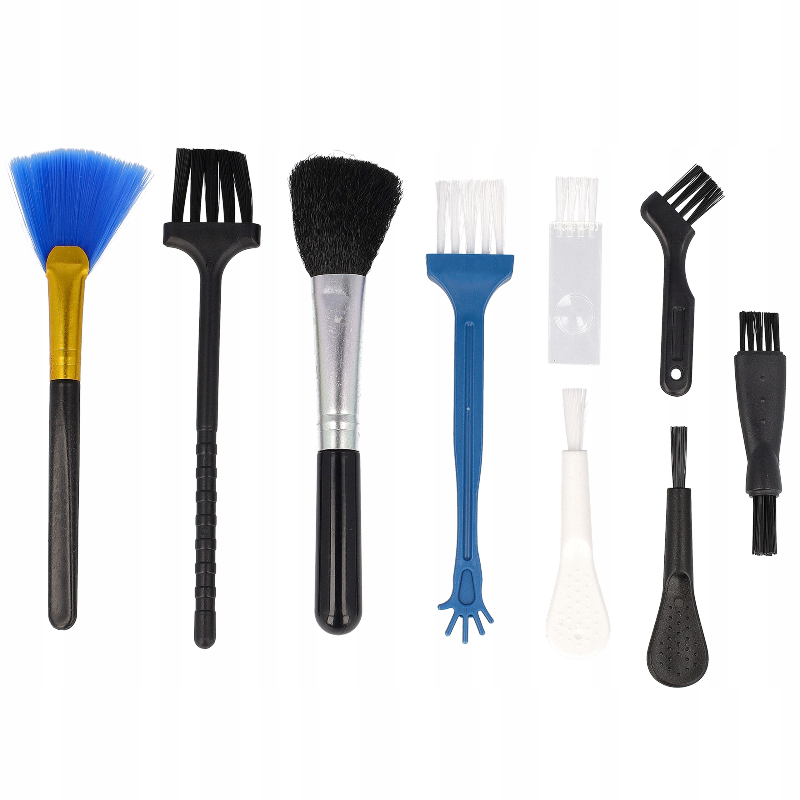набор воздуходувки включает в себя 8 чистящих кистей , которые позволяют эффективно чистить различные поверхности и элементы. Благодаря разнообразным формам и твердости щетинки, вы можете безопасно чистить, среди прочих клавиатур, вентиляторов, вентиляционных отверстий в автомобиле, электронного оборудования или жестких уголк и липков мебели и оборудования.